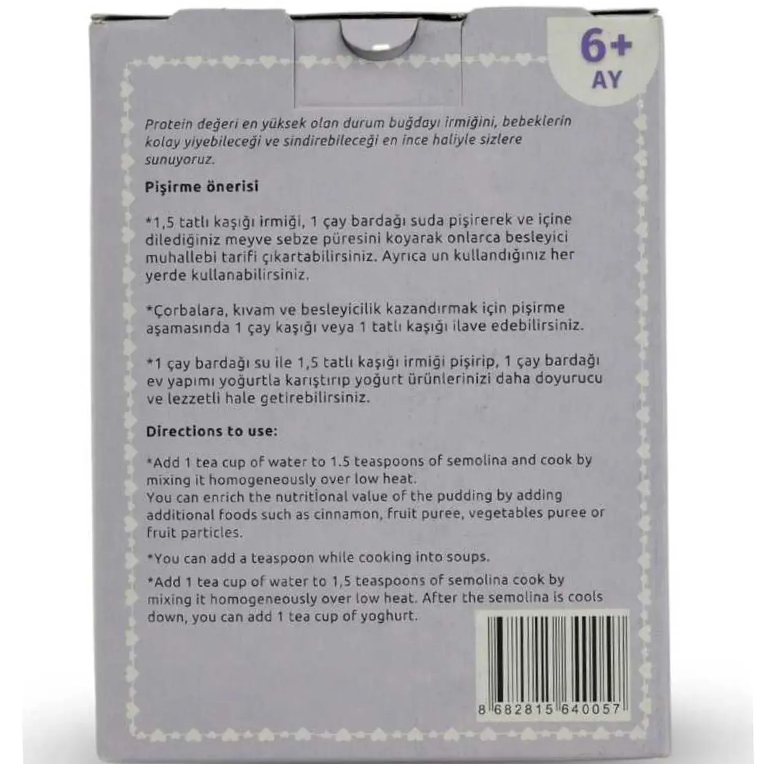 Protein değeri en yüksek olan durum buğdayı irmiğini, bebeklerin en kolay sindirebildiği en ince haliyle siz minik gurmelerimize sunuyoruz.