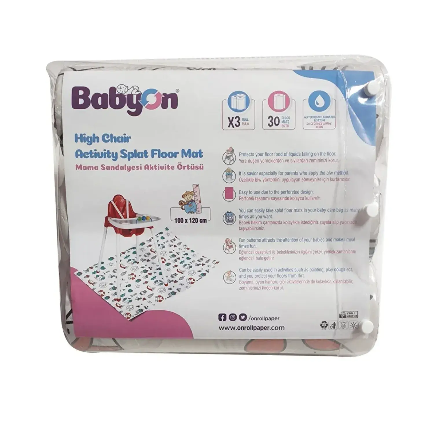 Baby On Mama Sandalyesi Ve Aktivite Örtüsü, tek kullanımlık, sıvı geçirmez, kullan at, mama sandalyesi ve aktivite örtüsü, zarar görmeden saklayabileceğiniz, pratik, çıtçıtlı ambalajı içerisinde 3 rulo olarak gönderilmektedir.
