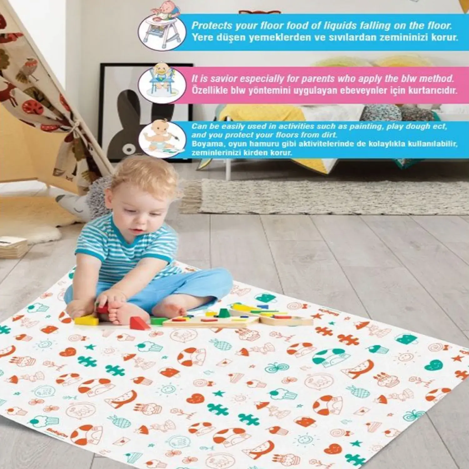 - Boyama, oyun hamuru gibi aktivitelerinde de kolaylıkla kullanabilir, zeminlerinizi kirden korur.