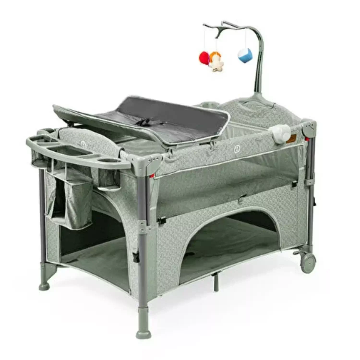 Dört kola asılabilen plastik bakım organizatörü, biberon ve bebek bakım ürünleri için idealdir.