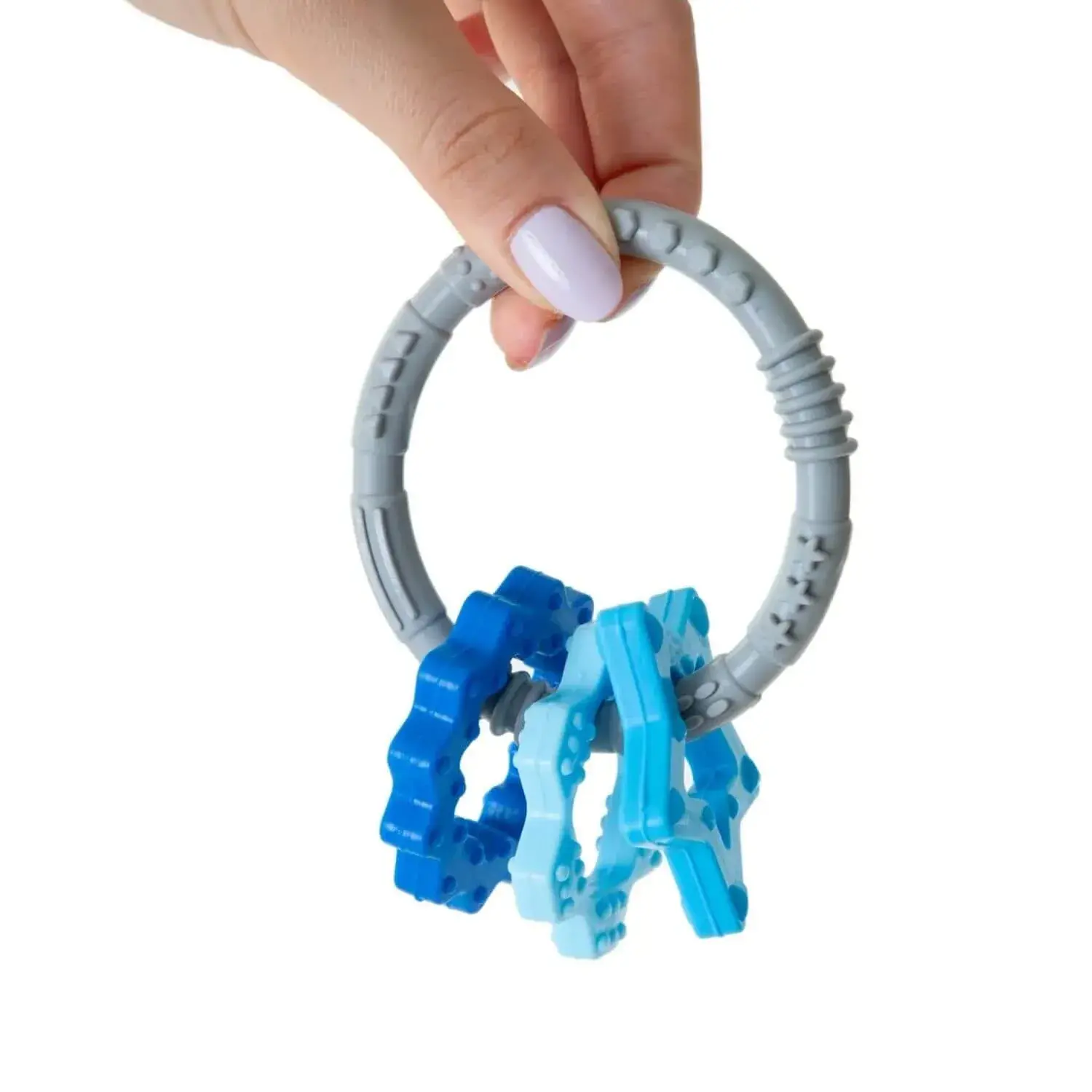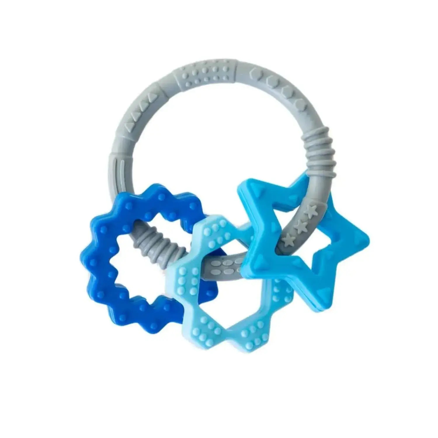 - %100 gıdaya uygun silikondan üretilen bu diş kaşıyıcılar, miniklerin ilgisini çeken 1 büyük dokulu halkadan ve 3 küçük dokulu halkadan oluşur.