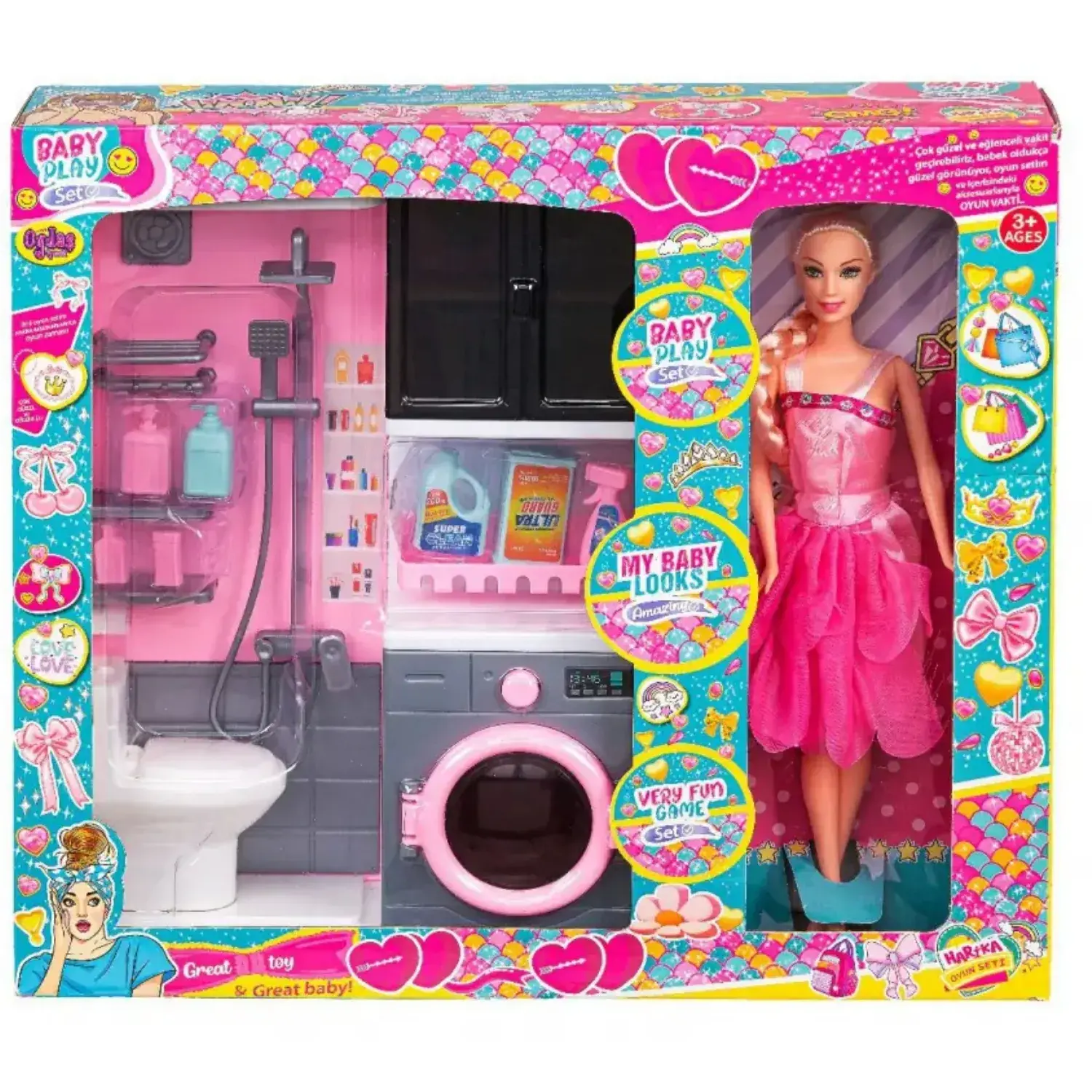 - Gerçekçi çamaşır makinesi tasarımı ve sevimli bebek figürüyle çocuklar hem eğlenecek hem de hayal güçlerini geliştirecek.