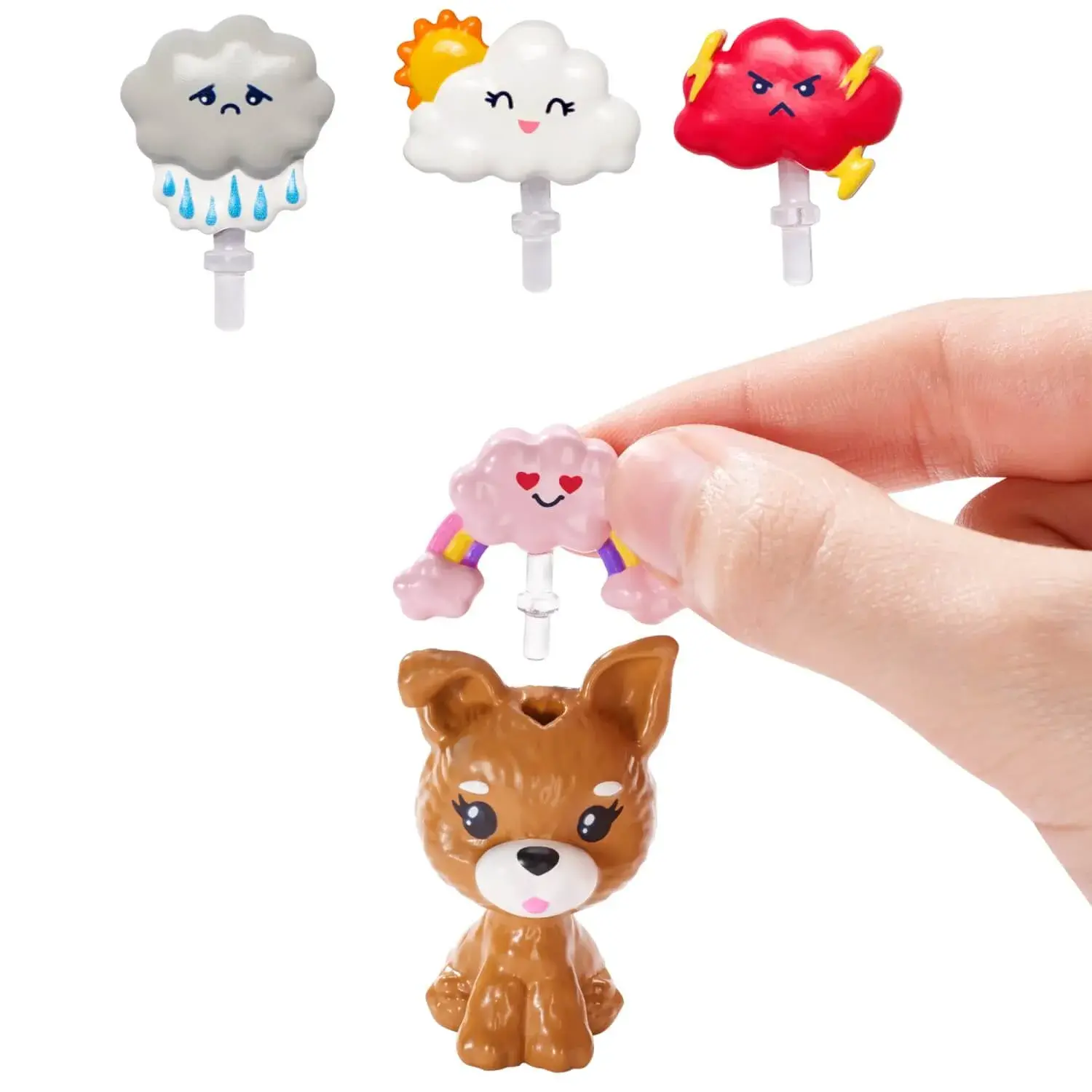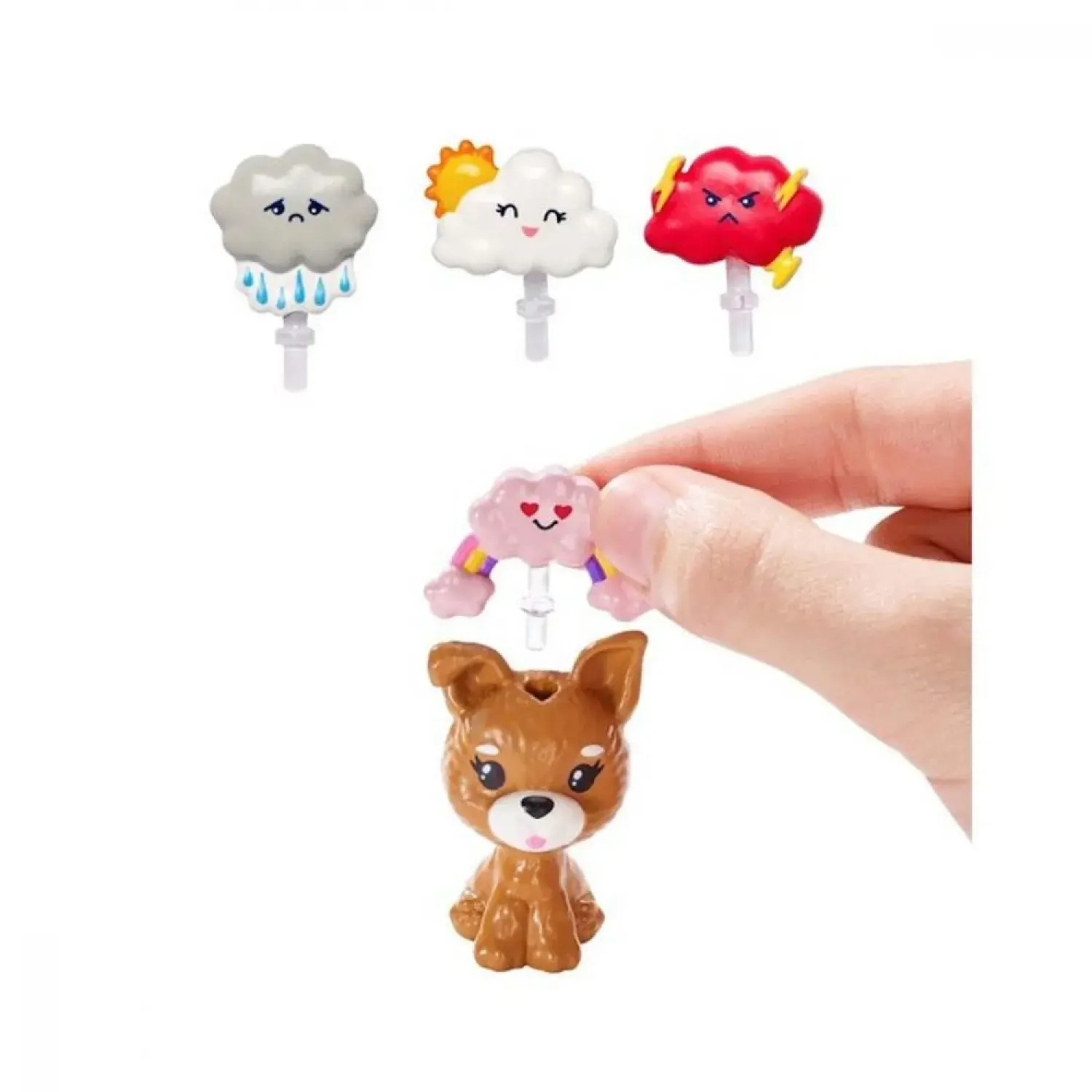 - Sette bir Barbie bebek, bir köpek yavrusu ve dört bulut emojisi var.