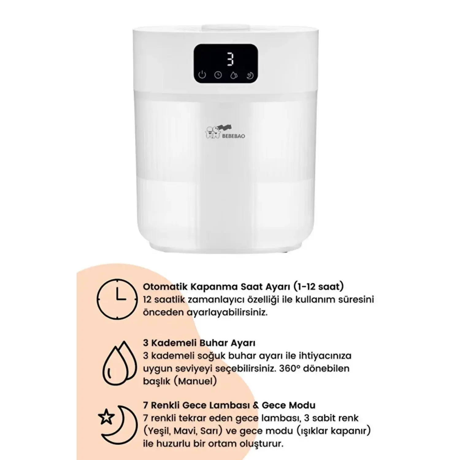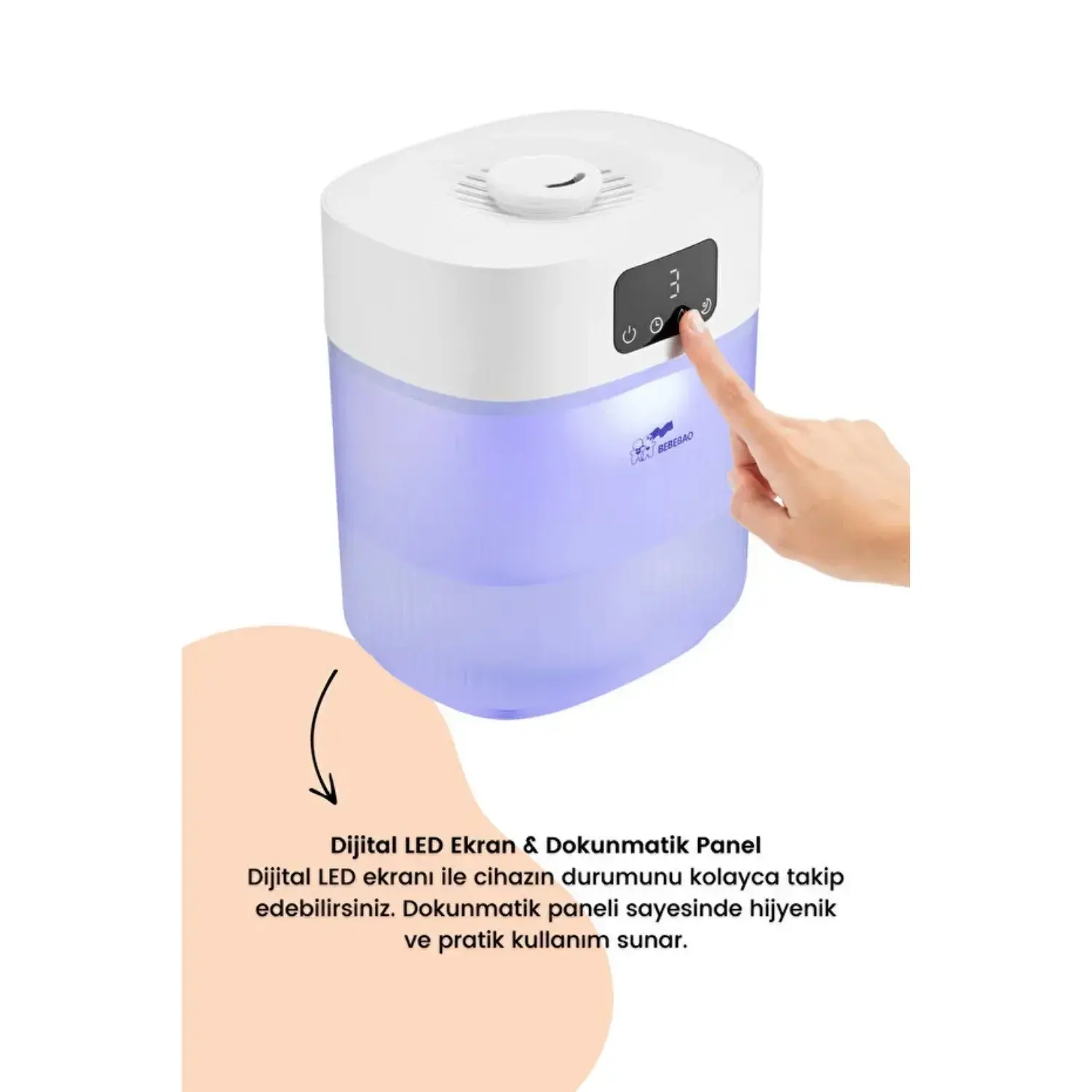 Dokunmatik Panel; - Cihazın üzerinde bulunan dokunmatik panel, kullanımını oldukça kolaylaştırır; Panel sayesinde nem seviyesi, ışık renkleri ve diğer ayarları zahmetsizce kontrol edebilirsiniz; Kullanıcı dostu tasarım, ürünü her yaştan kişi için erişilebilir hale getirir.