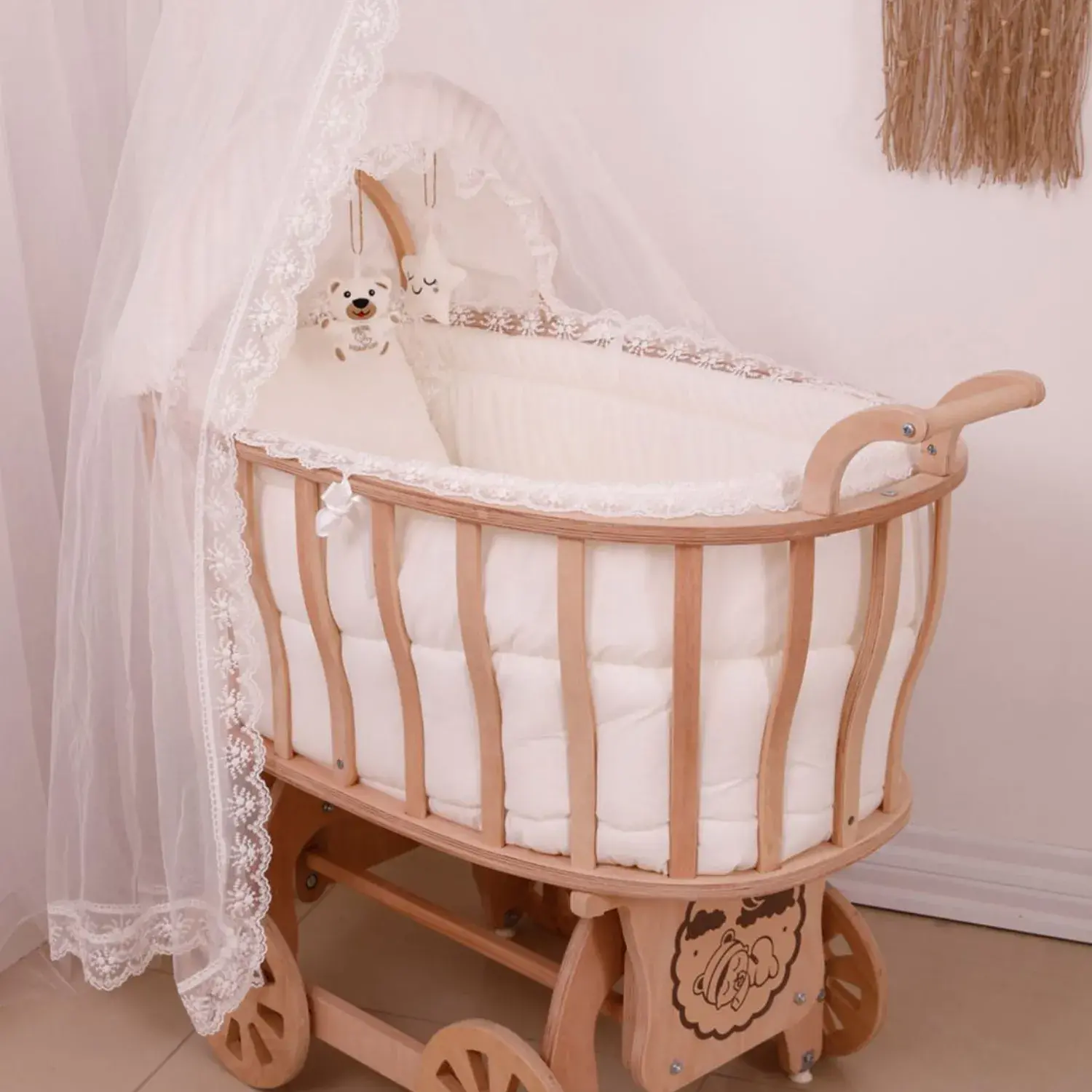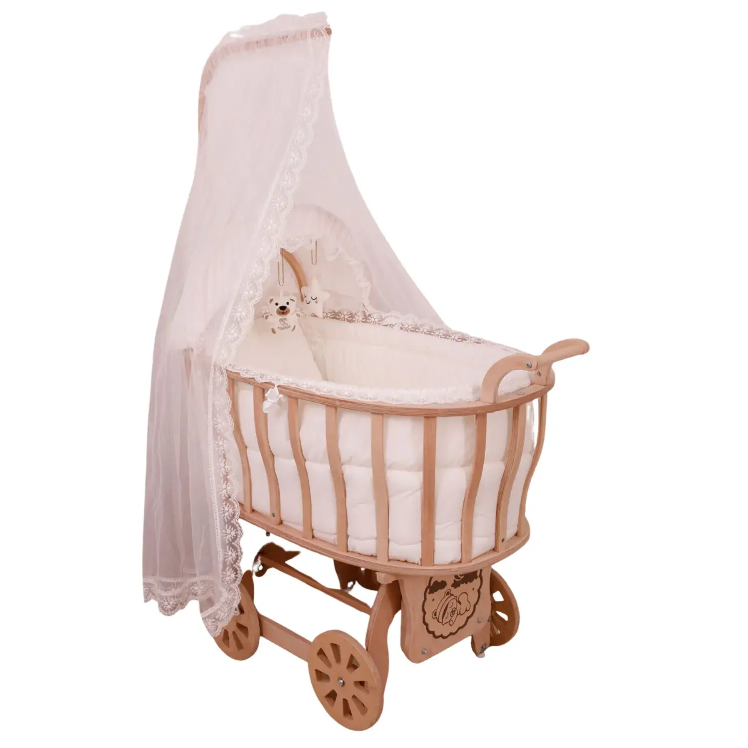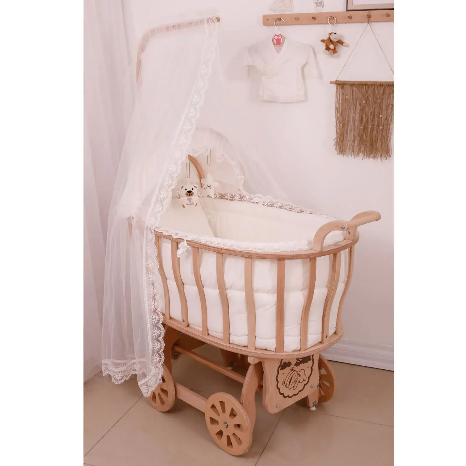 - 4 adet ahşap tekerlek mevcuttur.