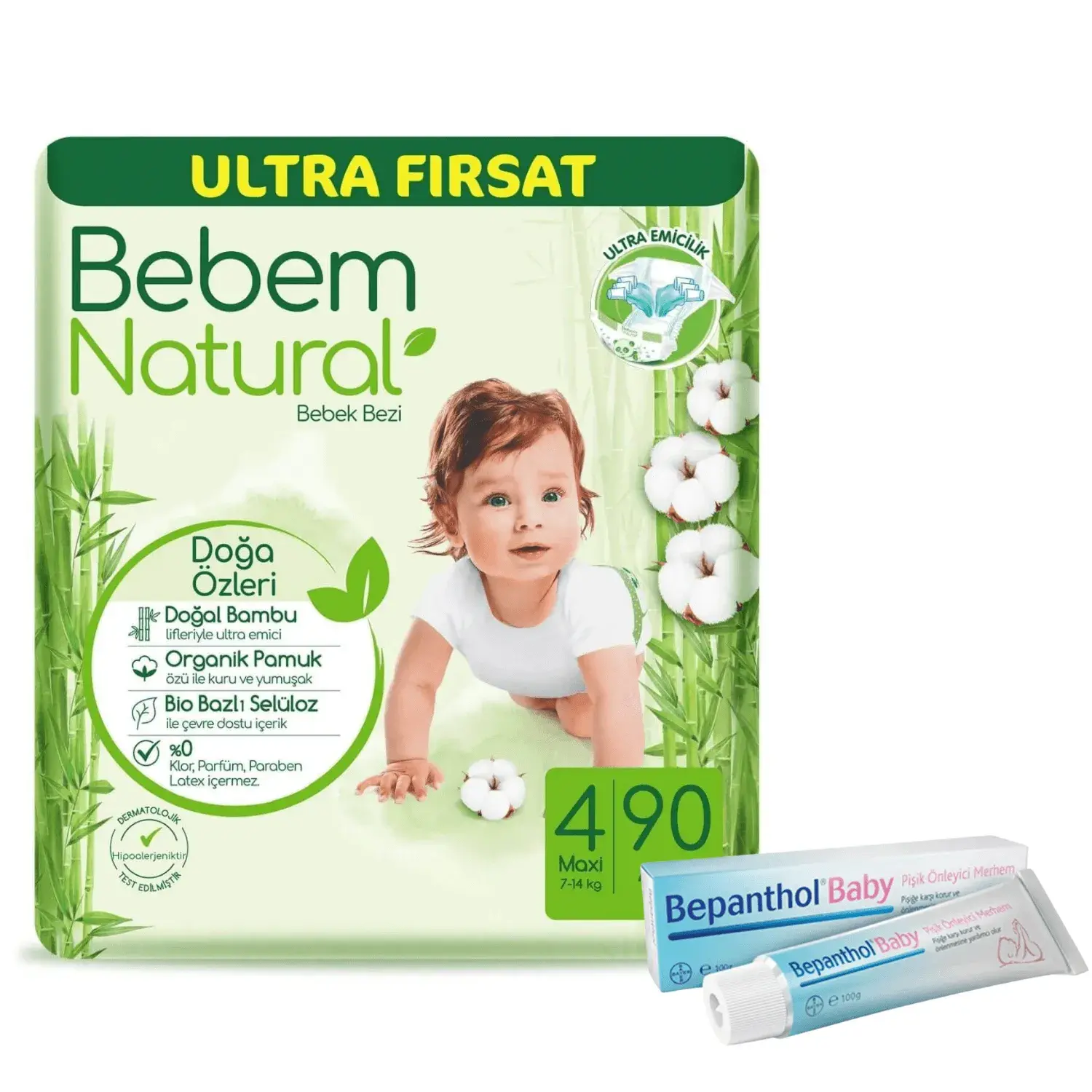 Bebem Natural Bebek Bezi 4 Beden Maxi 7-14 Kg 90lı Ult.Fır.+Bepanthol Baby Pişik Merhemi 100 gr