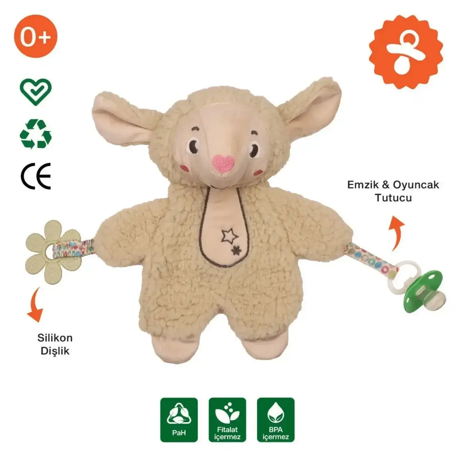 - Kuzunun elindeki yumuşak cırt kısmına emziği asarak kaybolmasını engelleyebilirsiniz.