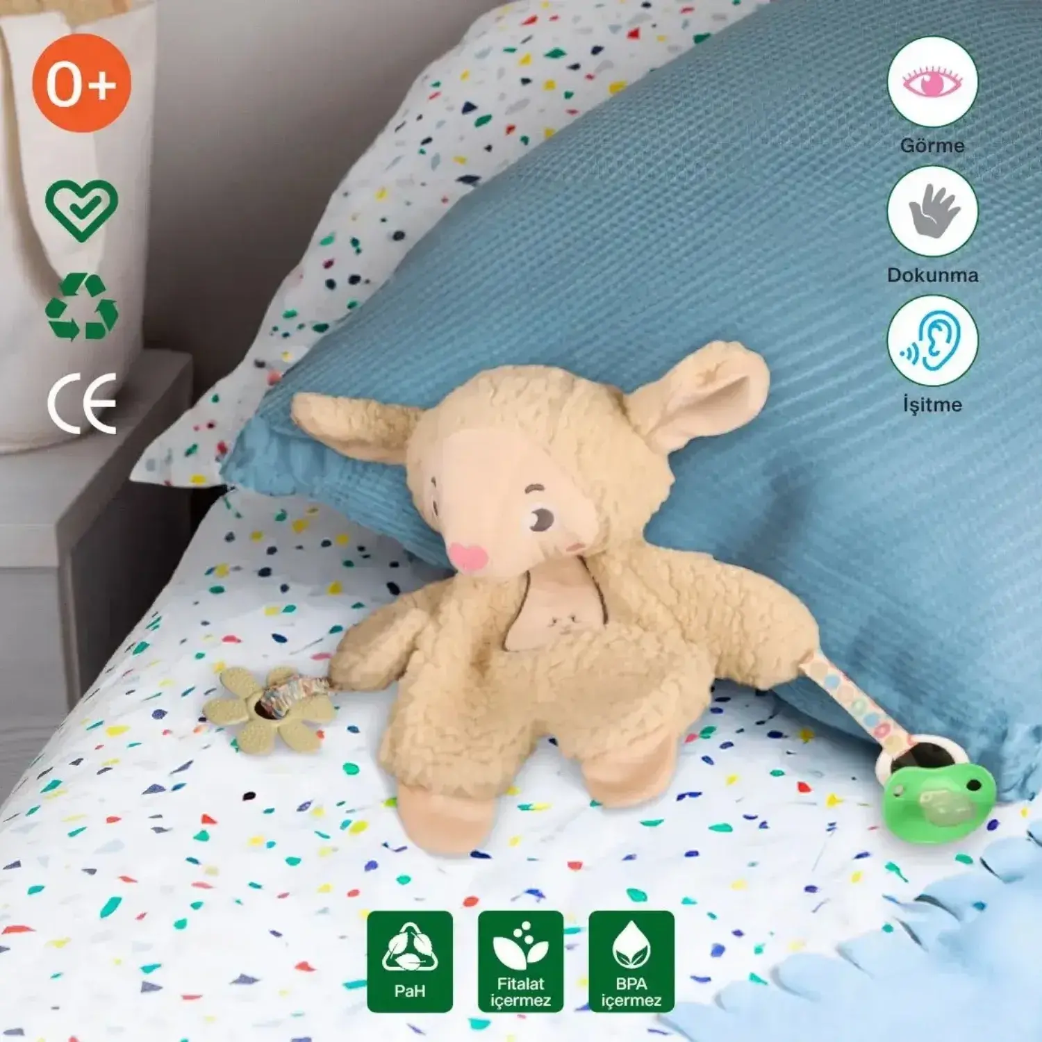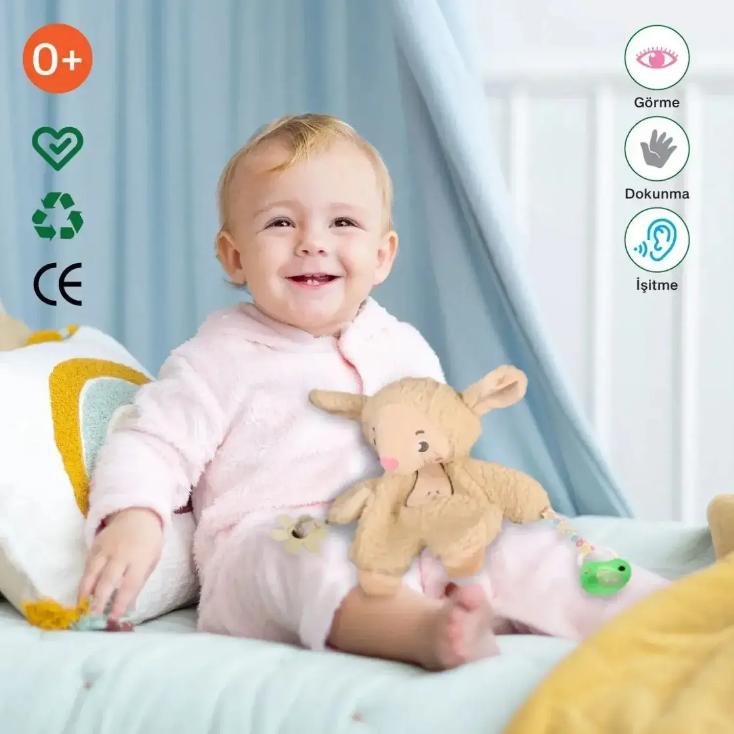 - Özel tasarım kumaşıyla bebeklerin dokunuşlarında rahatlık ve güven hissi sunar.