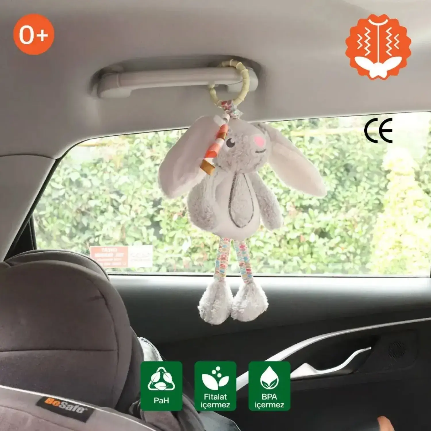 - Üzerindeki kanca sayesinde bebek arabası, oto koltuğu, mama sandalyesi ve beşik gibi birçok yere kolayca tutturabilir.