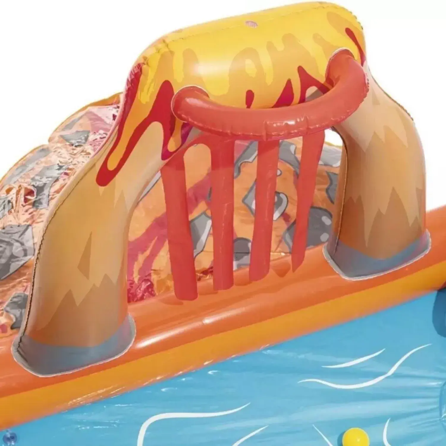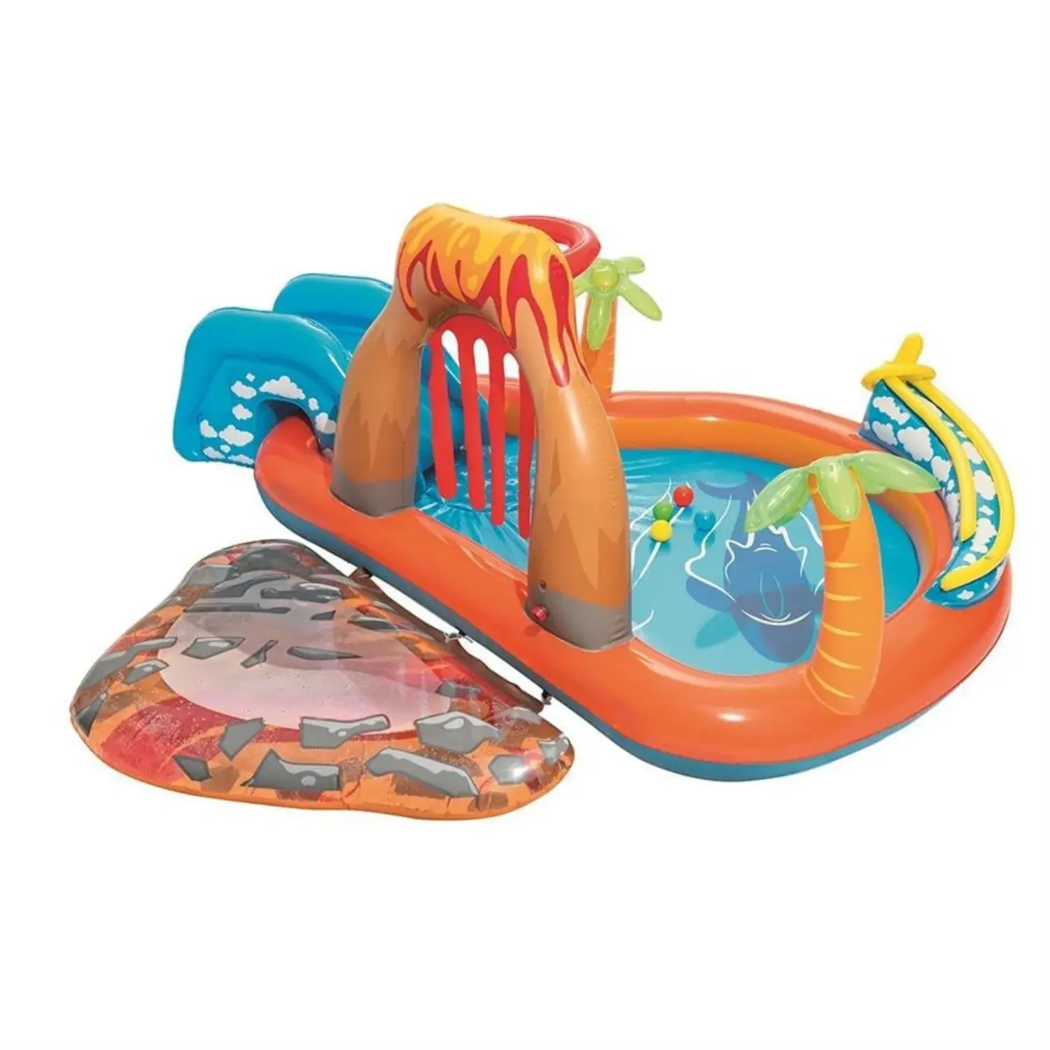 Havuz hızlı ve kolay bir şekilde kurulabilir. Bahçe hortumunuza takılabilen bir su püskürtücüye, bağlama halatları ve yerleşik rondelaları olan çıkarılabilir bir kızağa, halka atma oyunu için şişirilebilir bir halkaya, heyecan verici bir lav tüneline ve şişme top rampası boyunca yukarı aşağı yuvarlayabileceğiniz oyun toplarına sahiptir.