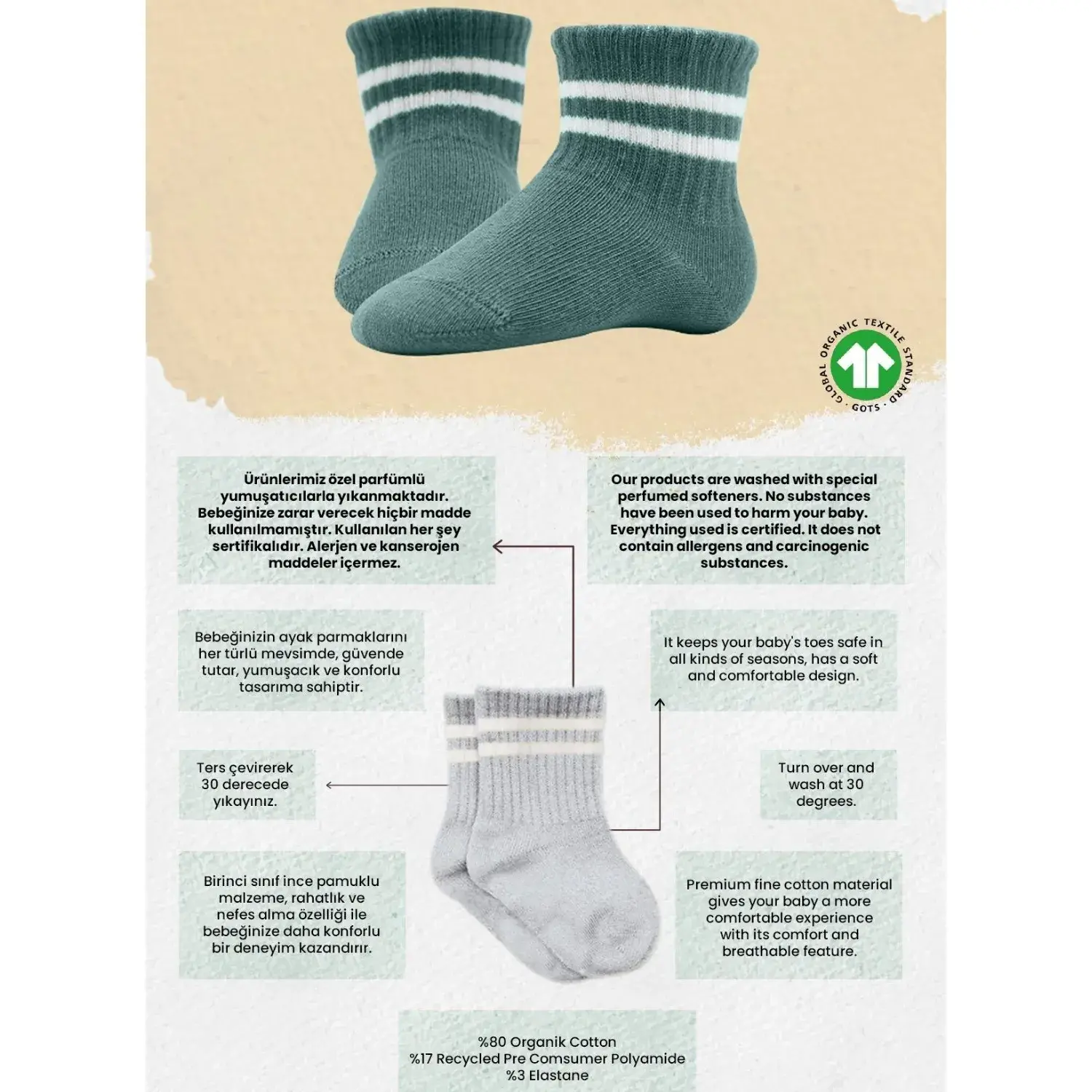 - Yumuşak, nefes alabilir, nem emici ve kokulu Bistil çoraplarımız minik bebekleriniz için özenle üretilmiştir.