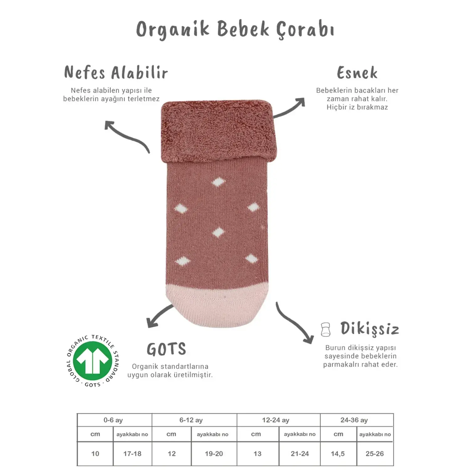 - Yumuşak, nefes alabilir, nem emici ve kokulu çoraplarımız, minik bebekleriniz için özenle üretilmiştir.