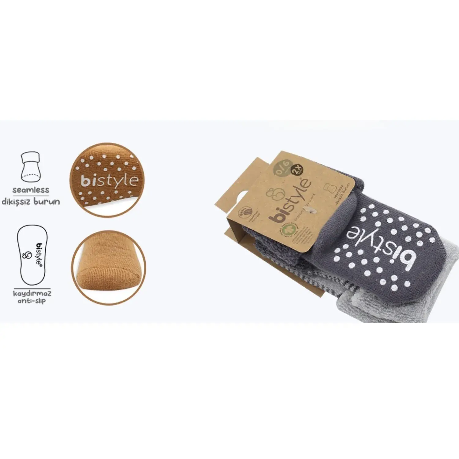Bibaby Unisex Organik Çorap Soket Havlu 2Li Kaymaz Çemberli Kıvrık Bistyle Gri - Antrasit