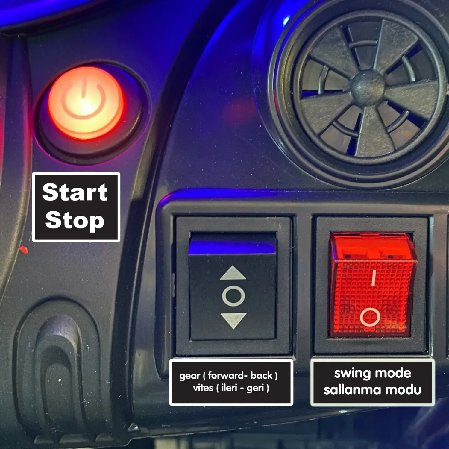 - Uzaktan kumandada ve araçta sallanma modu düğmesi bulunur.