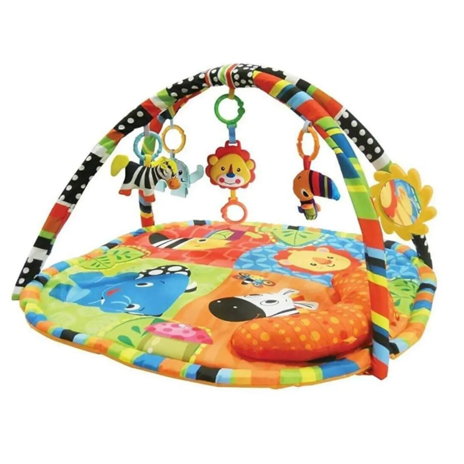 - Bebeğiniz halı üstünde yatıp oynayabilir; karın üstü yatarak eğlenebilir ve hışırdayan ayaklar ile kuyruğa sahip zebra, peluş papağan, melodiler çalan aslan, sevimli kelebek diş kaşıyıcı, büyük döner çıngıraklı topa sahip fil oyuncakları sayesinde keyifli zaman geçirebilir.