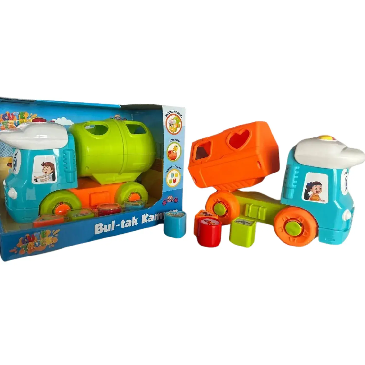 - Üçgen, daire, kalp, kare gibi geometrik şekillerden oluşan bul-tak oyuncak çocuğunuzun uygun şekilleri bularak kamyonun içine atmasını sağlar.