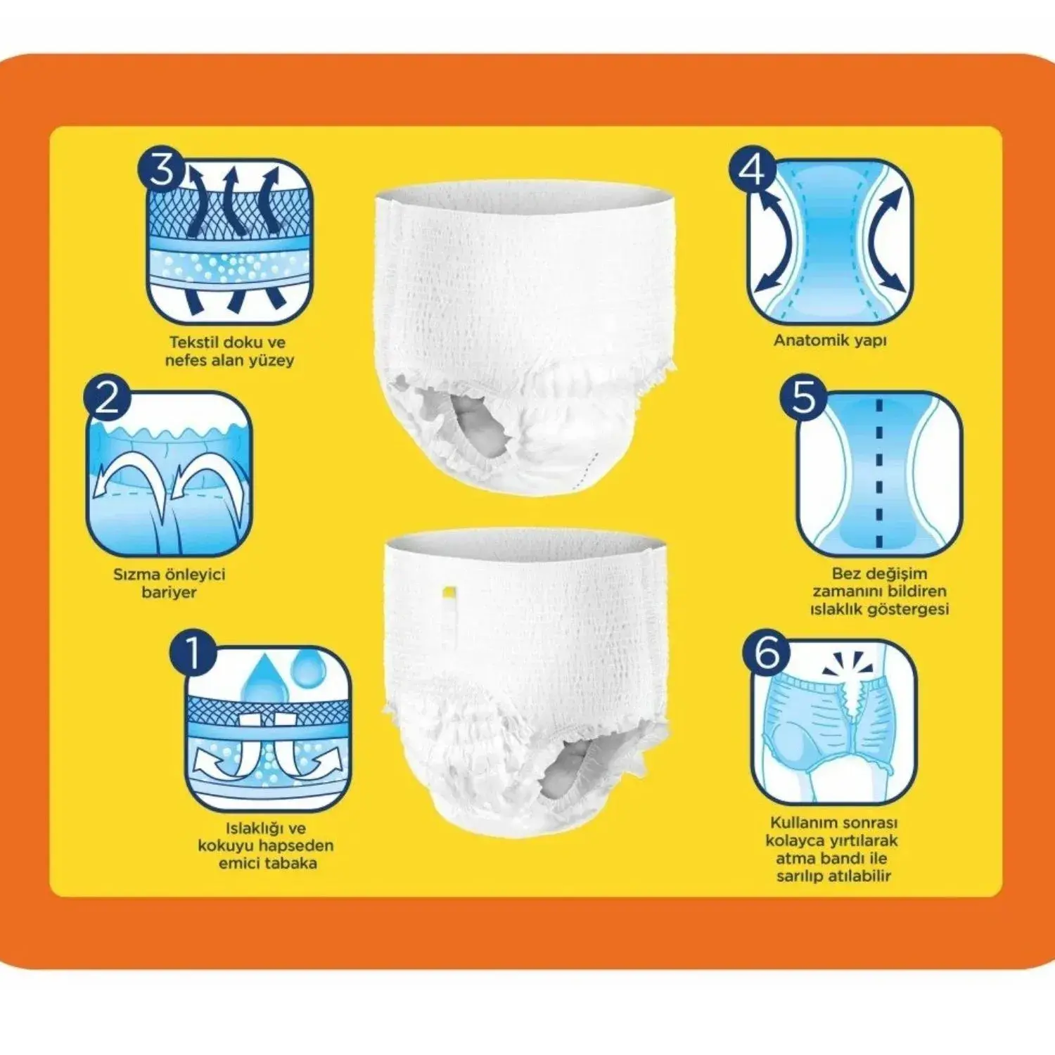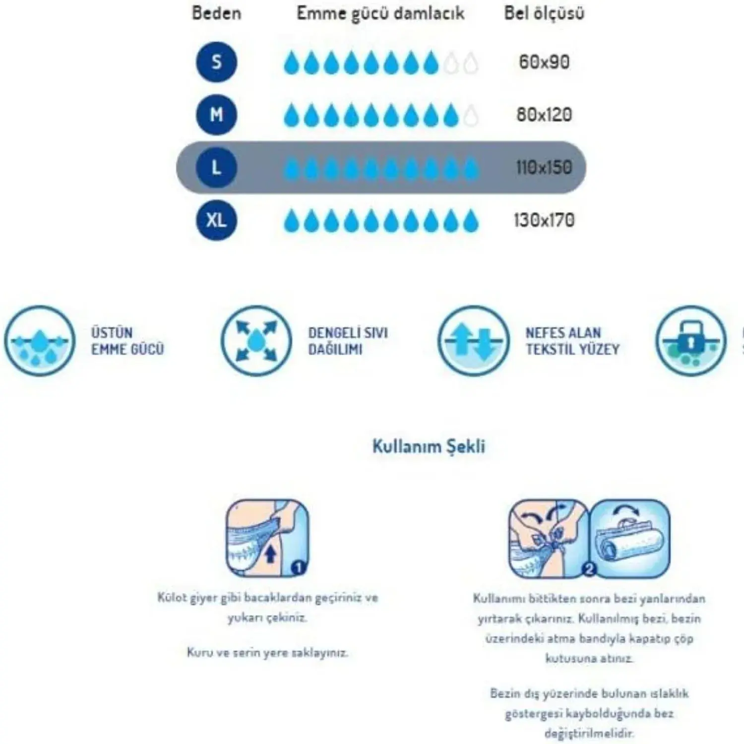 - Islaklık ve koyuyu hapseden özel emici tabakası sayesinde kuru ve güvende hissettirir.