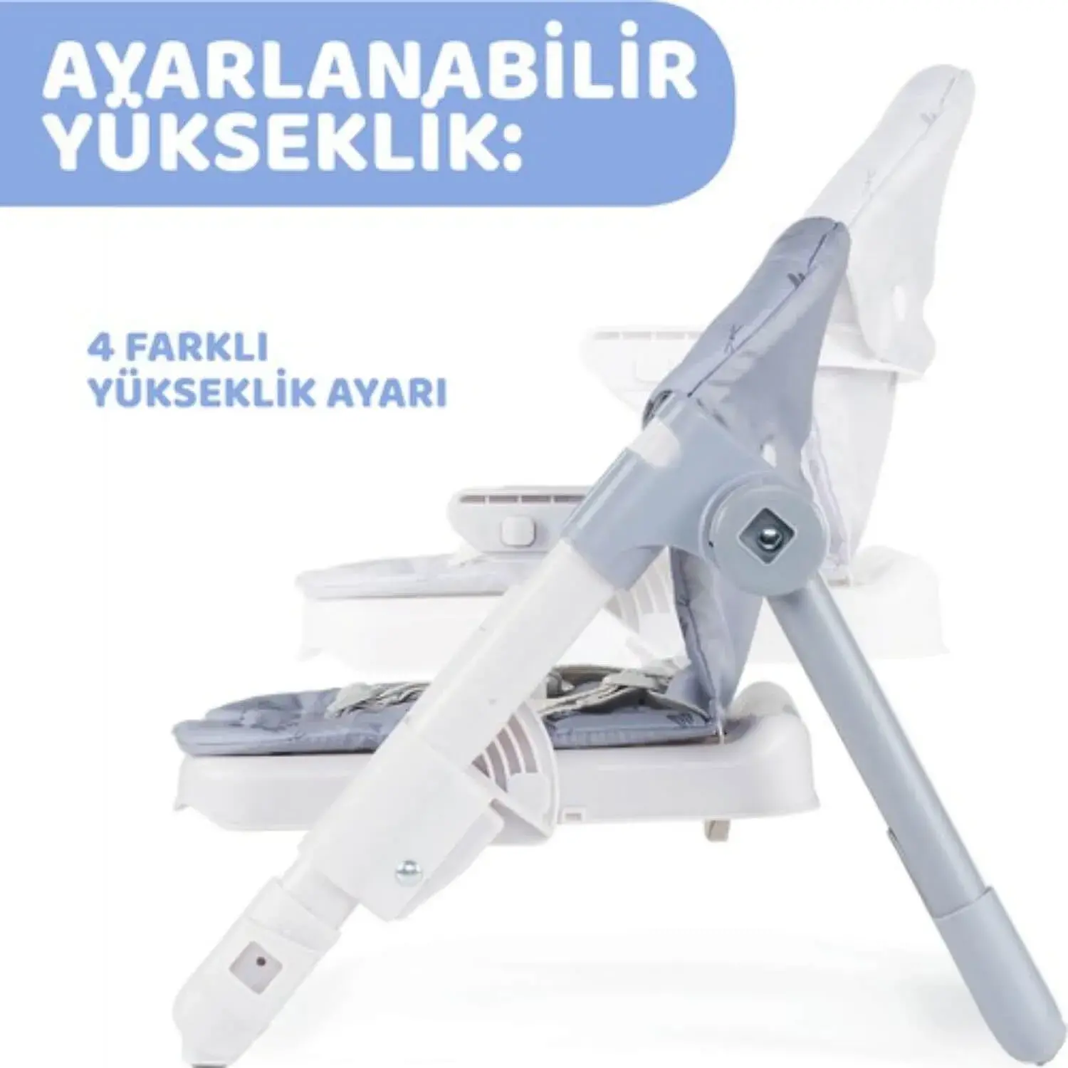 - Ayarlanabilir yükseklik: çocuğunuz büyüdükçe ona uyacak şekilde 4 farklı yüksekliğe ve ayrıca masa yüksekliğine göre ayarlanır.
