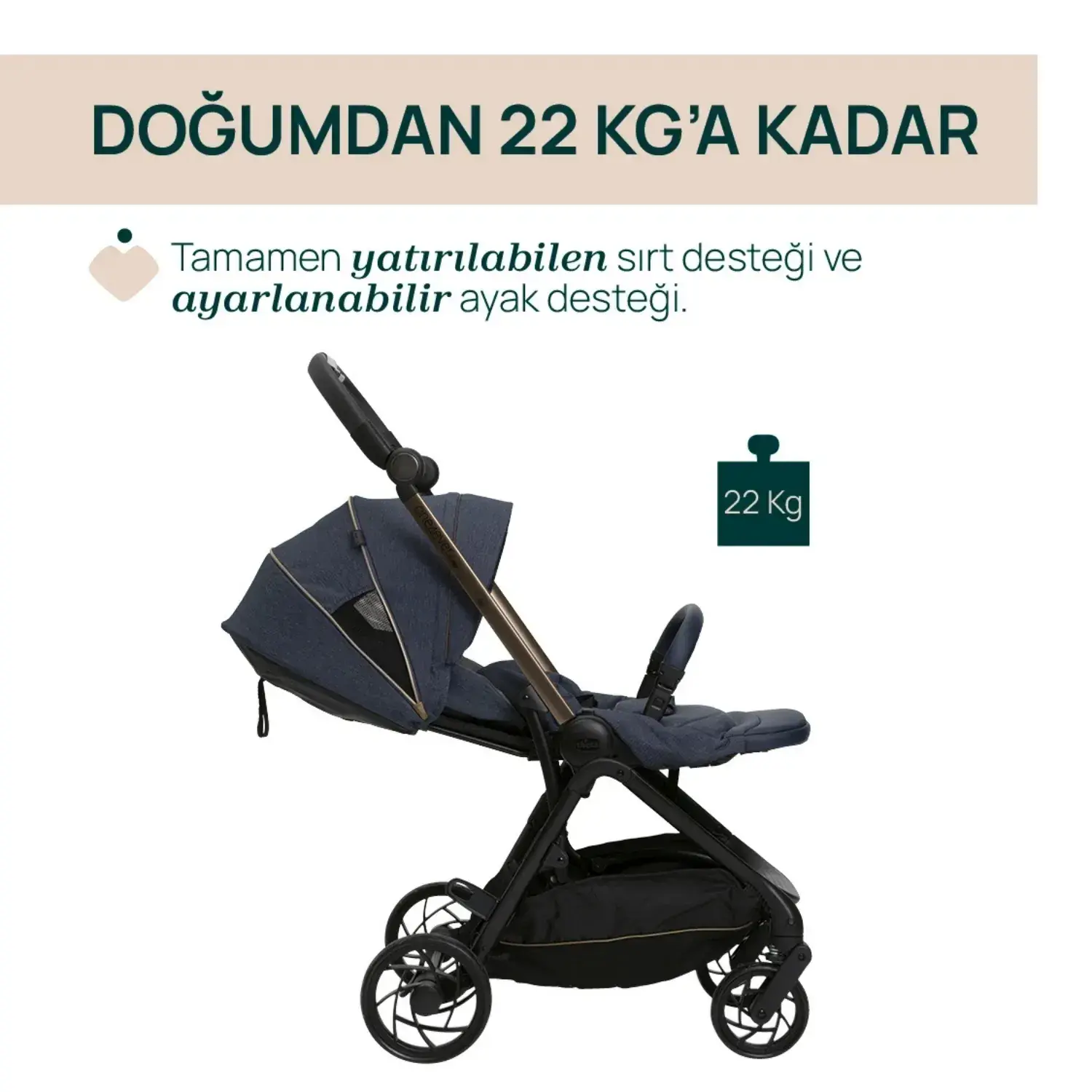 Doğumdan 22 kg'a Kadar(~0-4 Yaşa Kadar) Tamamen yatırılabilen sırt desteği ve ayarlanabilir ayak desteği bulunur. (0-22 kg ileri yönlü kullanım, 0-15 kg ise geriye dönük kullanım)