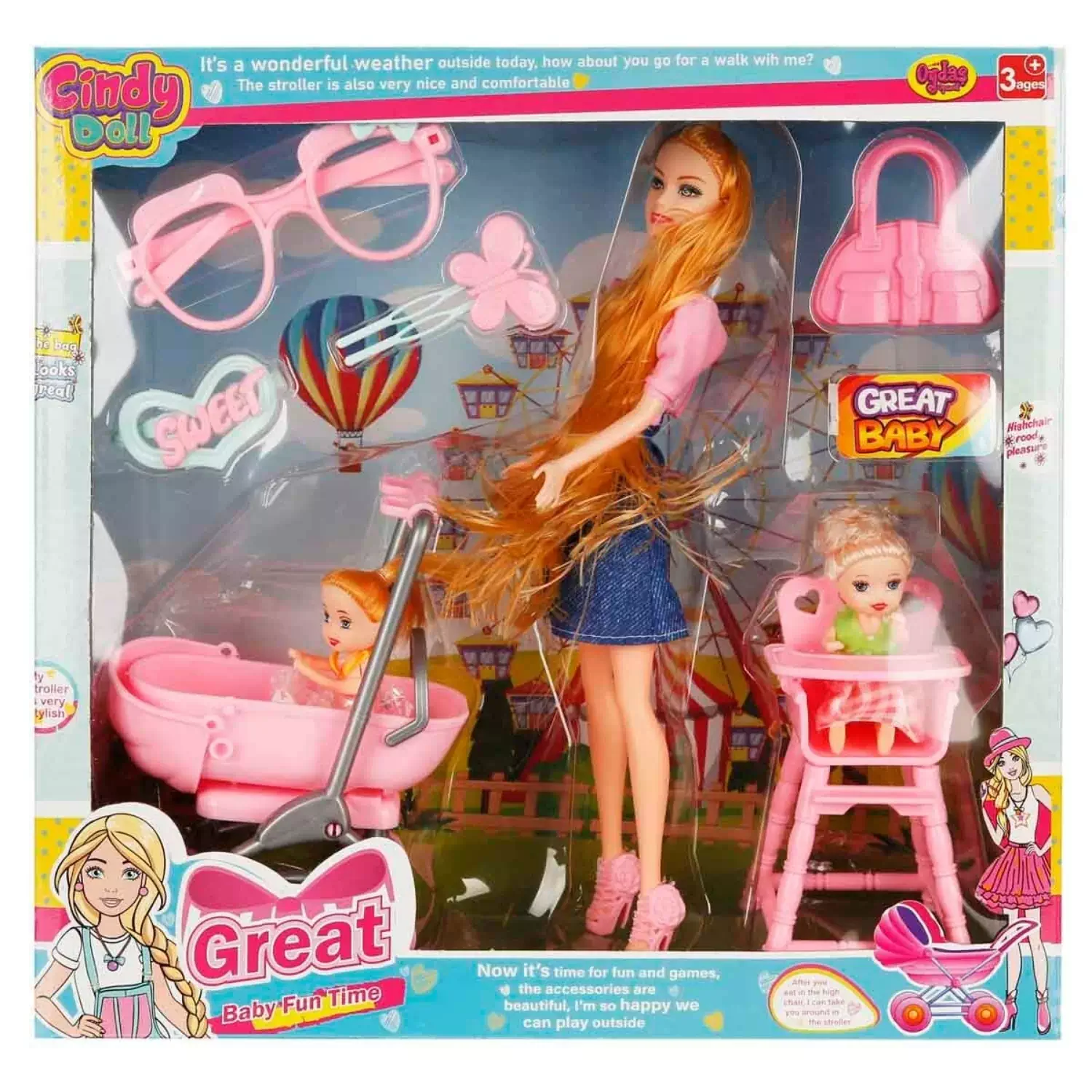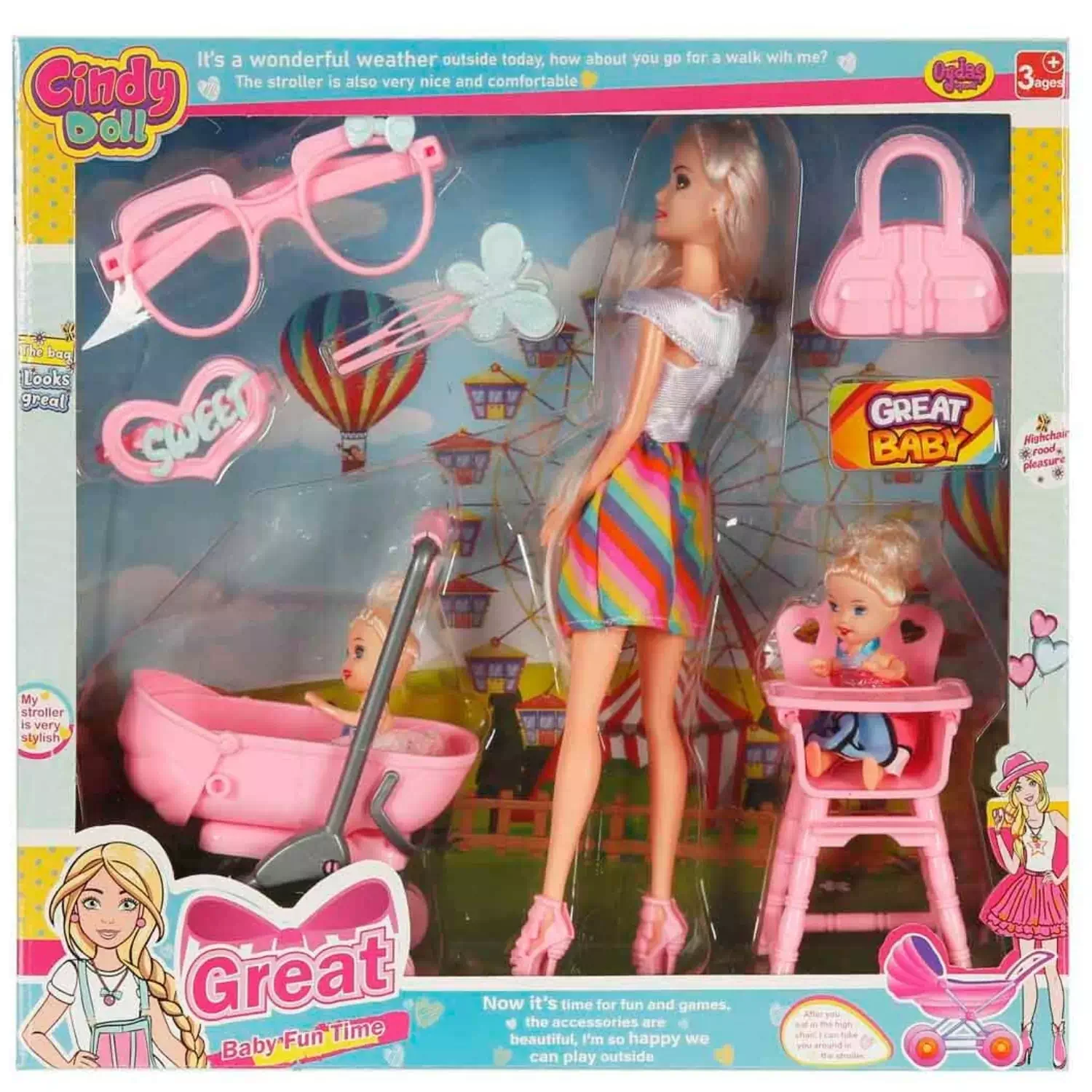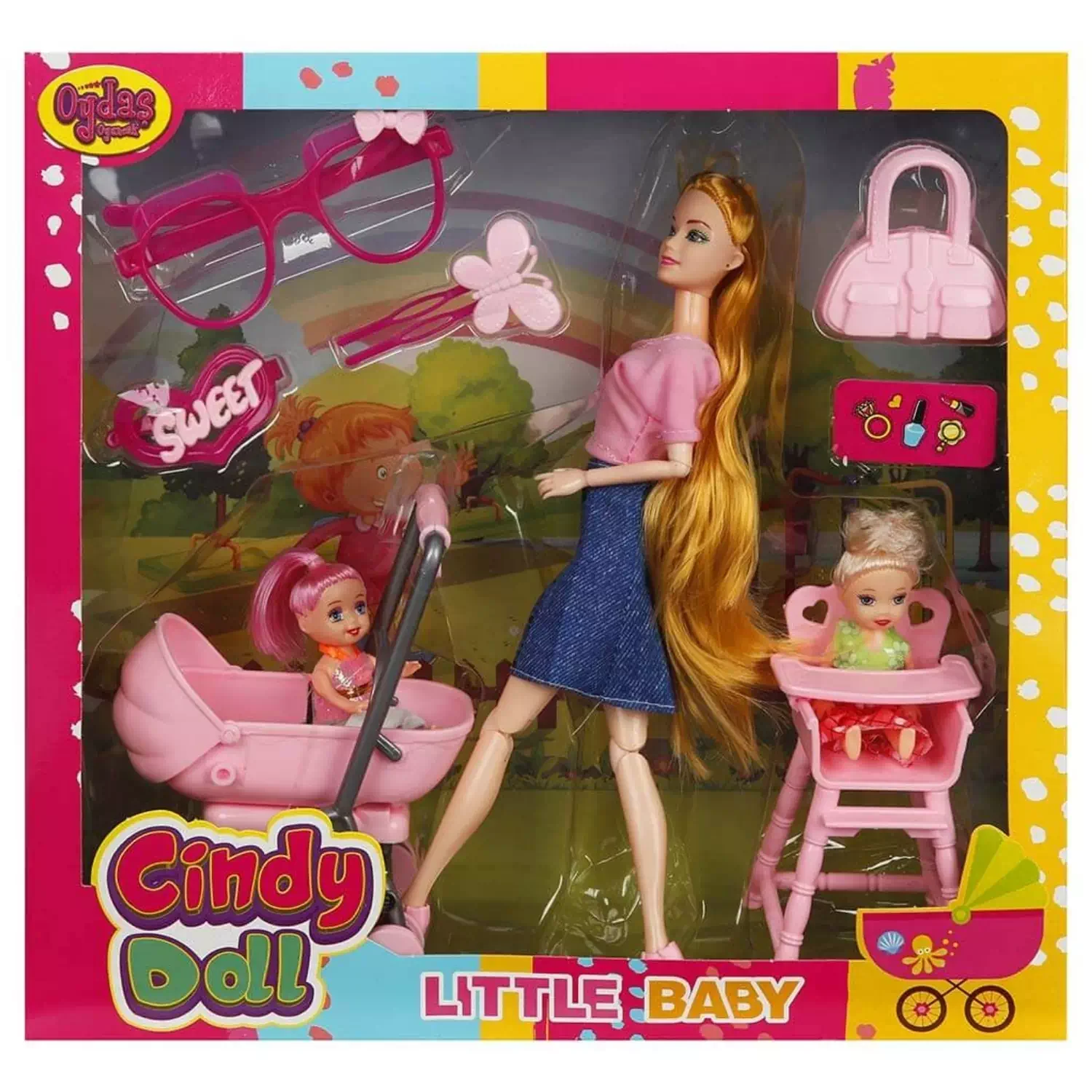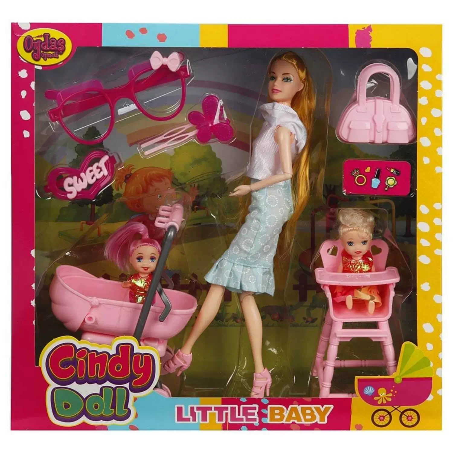 Set içerisinde; Cindy bebek, ikiz bebekler, bebek arabası, çanta, mama sandalyesi, gözlük ve tokalar yer almaktadır.