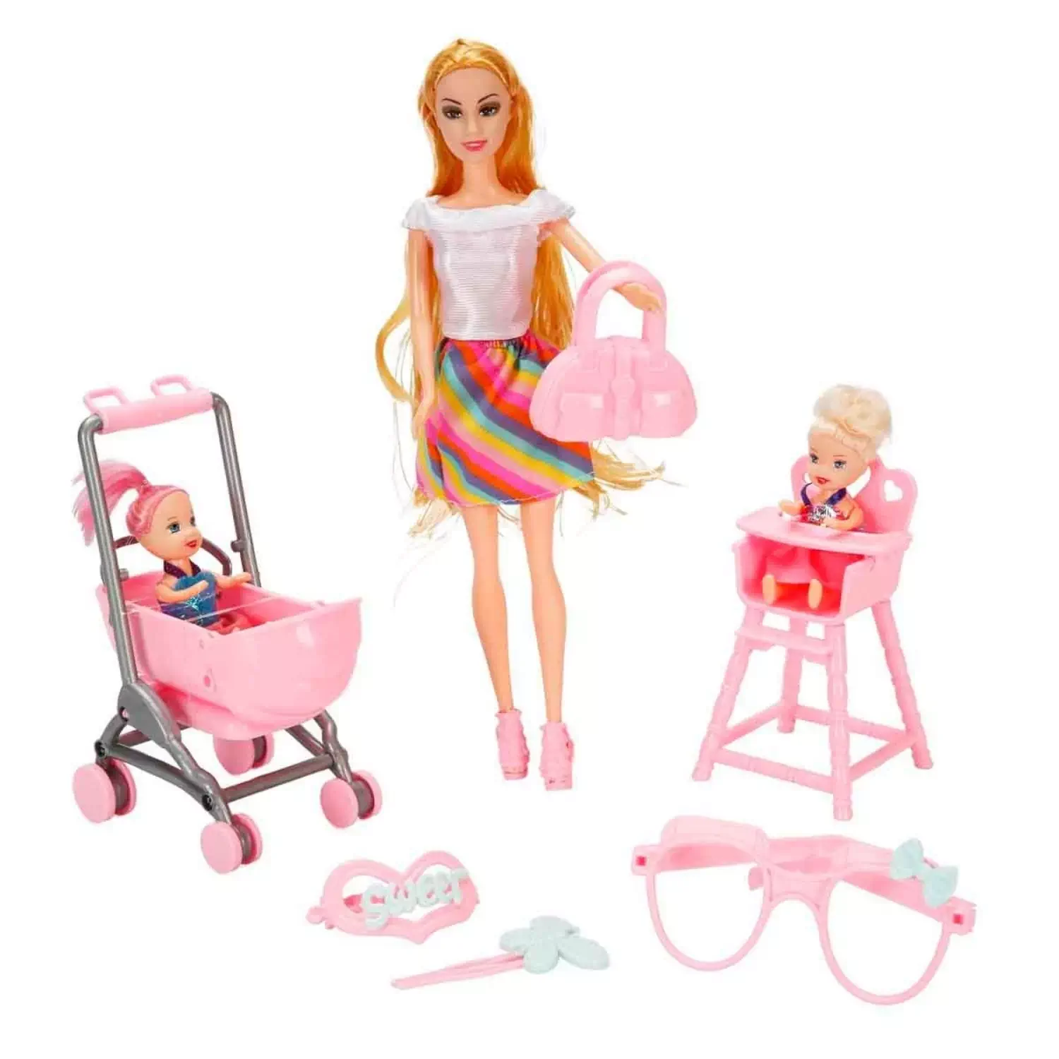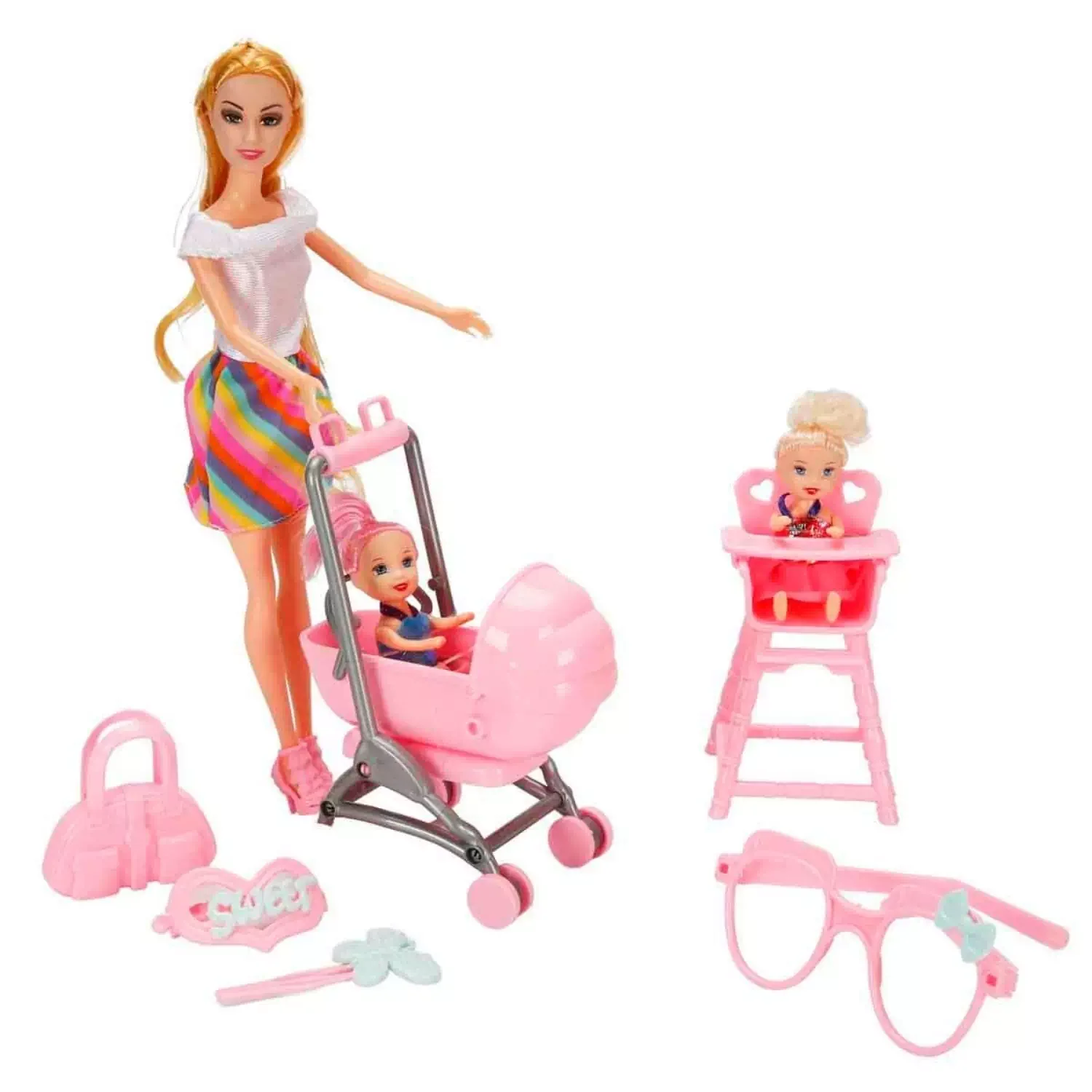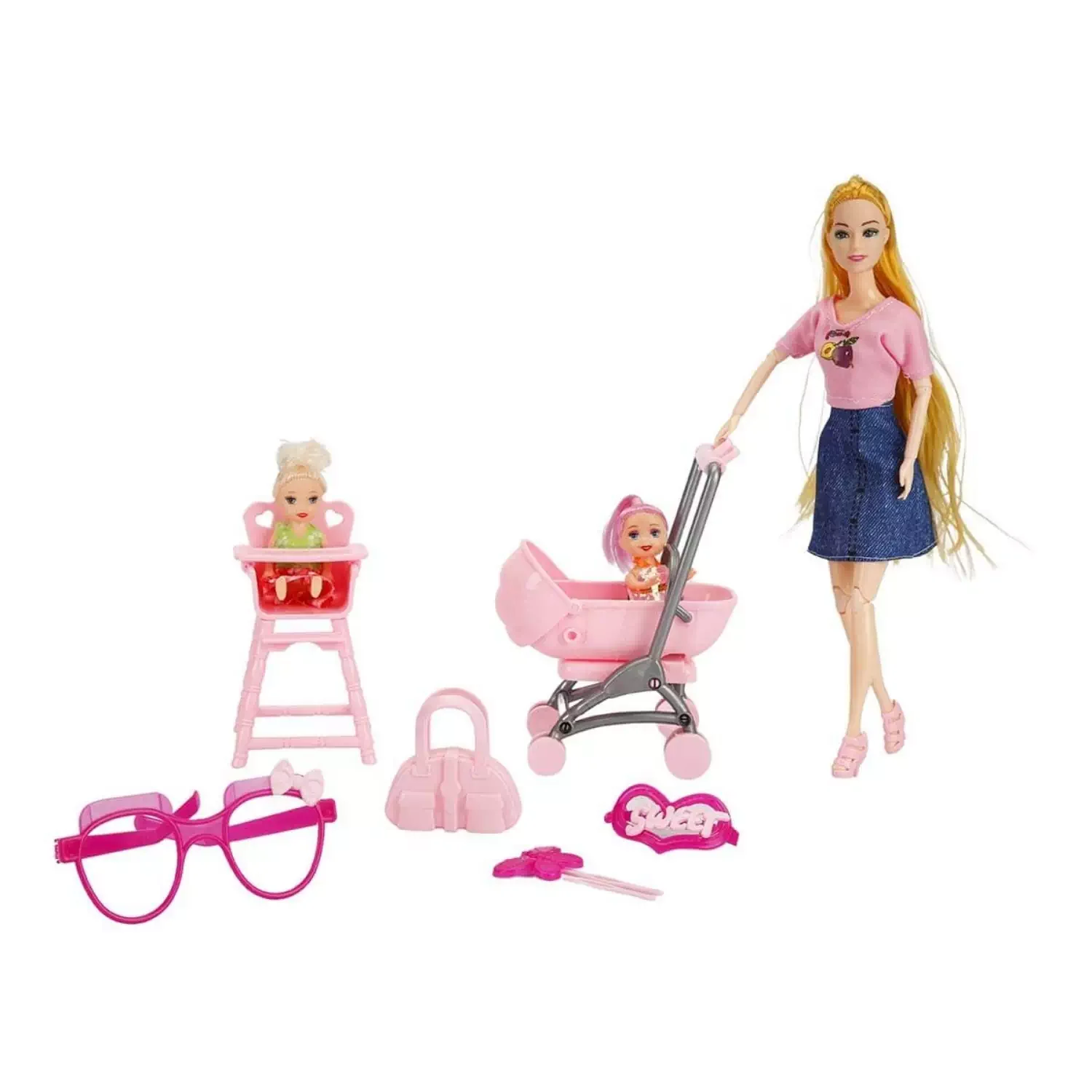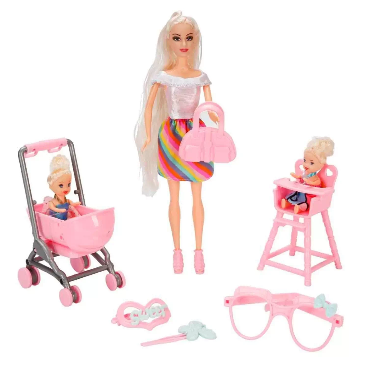 Set içerisinde; Cindy bebek, ikiz bebekler, bebek arabası, çanta, mama sandalyesi, gözlük ve tokalar yer almaktadır.