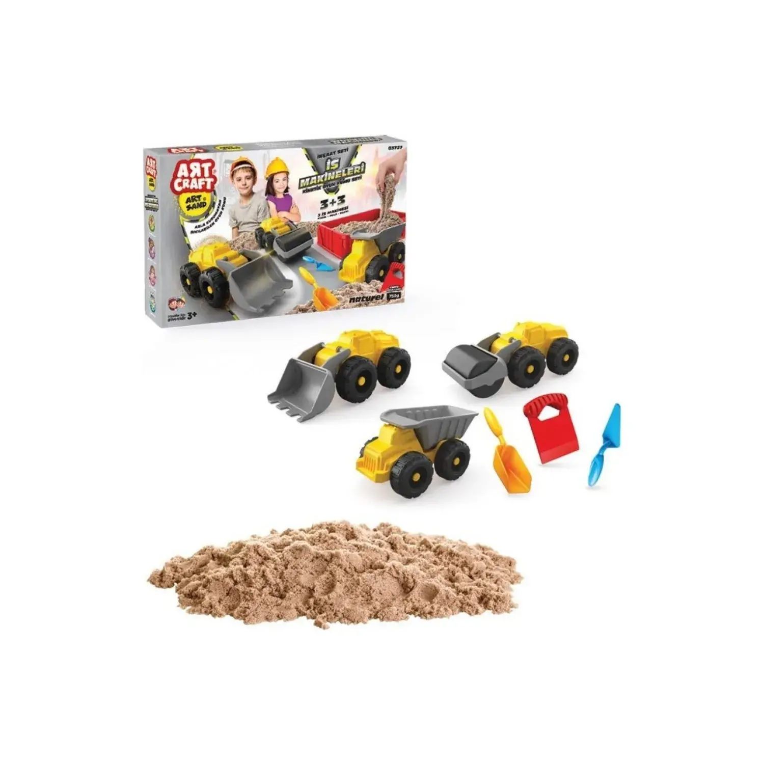 - Çocuklar için tasarlanmış eğlenceli bir kum oyunu setidir. Bu set, iş makinelerinin figürlerini içeren, 750 gramlık kum ve çeşitli araçları içerir.