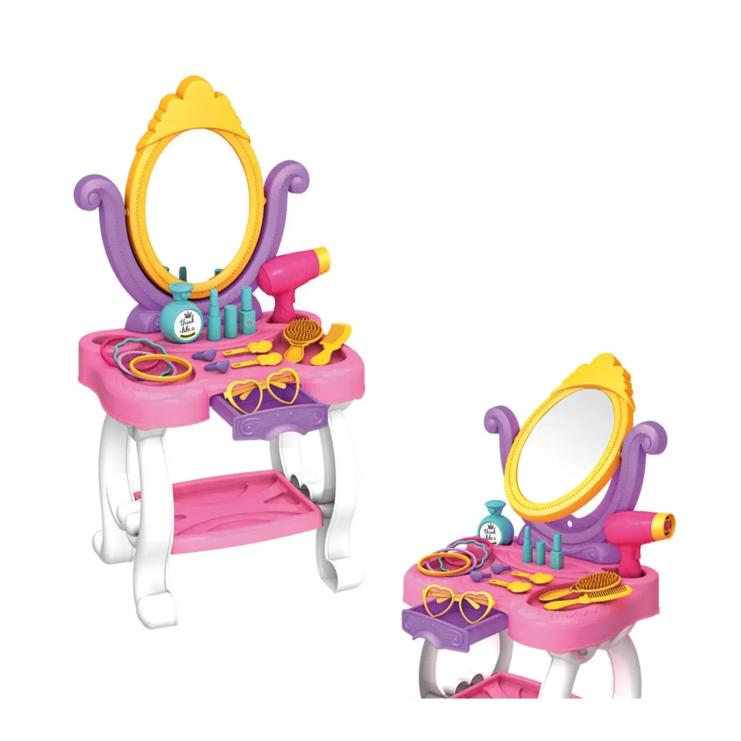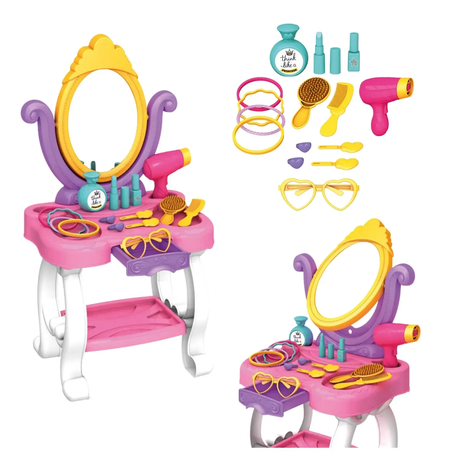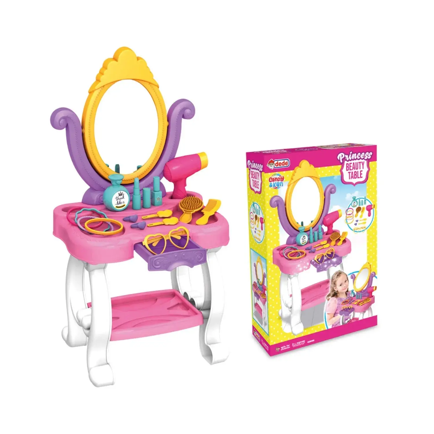 - Setin içerisinde; Şık tasarıma sahip ve sevimli bir aynası bulunan makyaj masası, fön makinesi, saç fırçası ve tarağı, bileklikler, gözlük, tokalar, oyuncak makyaj malzemeleri ve parfüm bulunmaktadır.