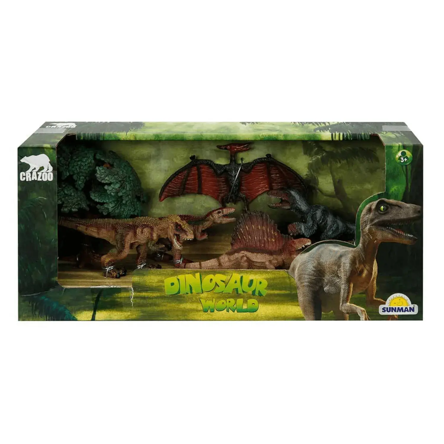 Set içerisinde; 5 farklı dinozor, 1 ağaç ve 1 kaya parçası yer almaktadır.