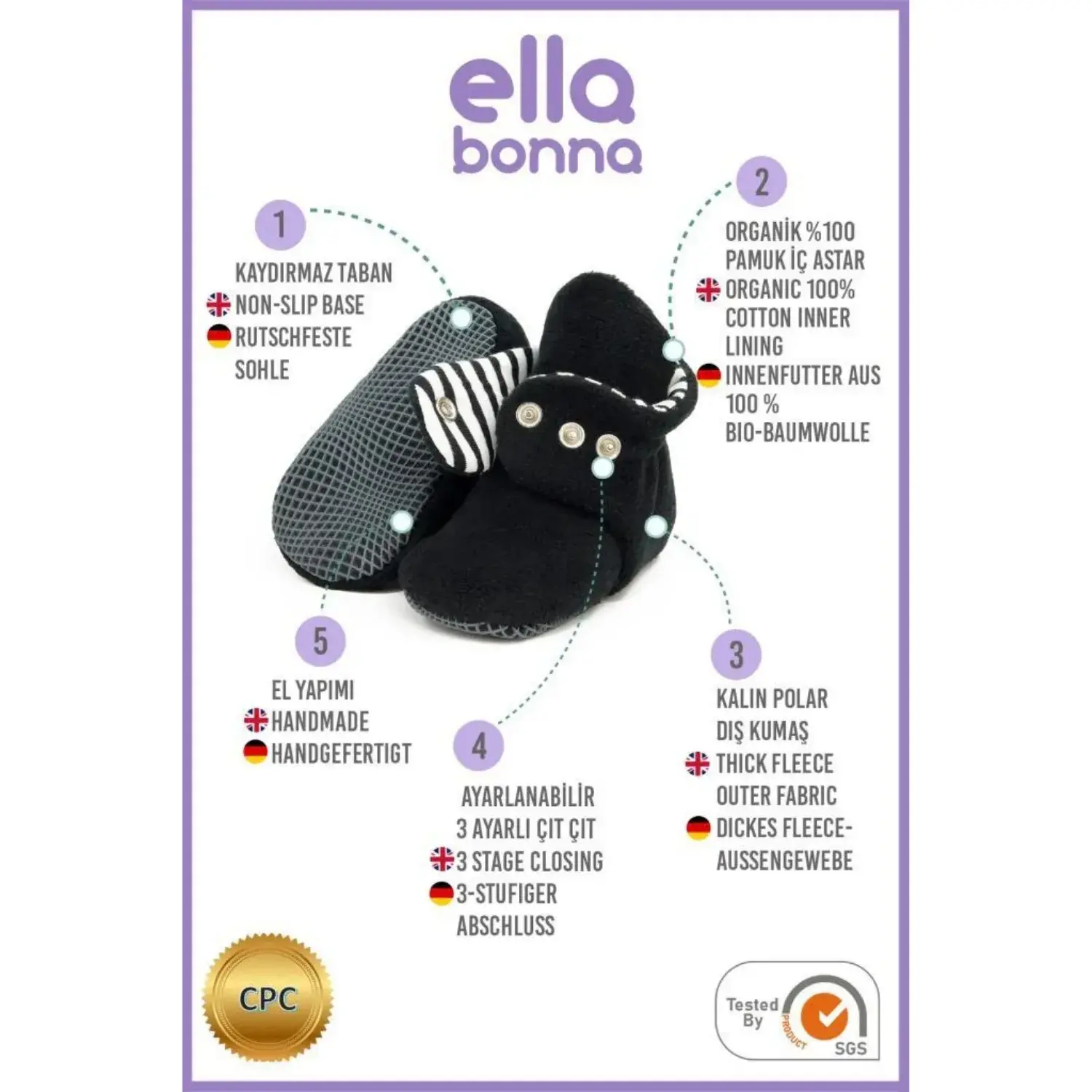 Soğuk sonbahar ve kış günlerinde bebeklerinizin ayaklarını sıcacık tutmak için kullanabileceğiniz polar panduf modelleri, Ella Bonna’da yüksek kaliteli malzemeler ile üretilir. Panduf seçimi yapılırken en çok dikkat edilmesi gereken husus, üründe kullanılan malzemelerin doğallığı ve kalitesidir.