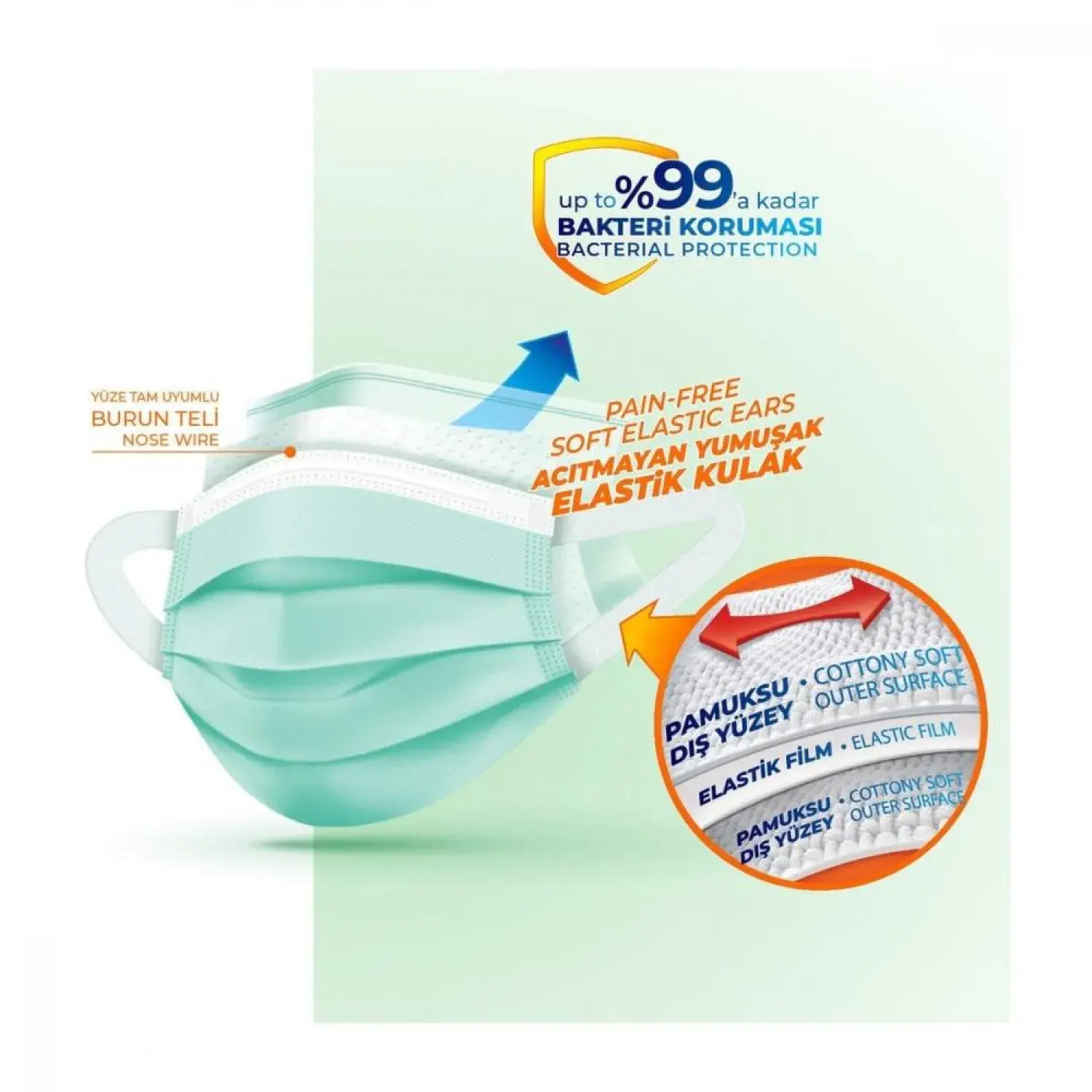 - Ürün içindeki burun teliyle yüze tam uyum sağlama özelliği