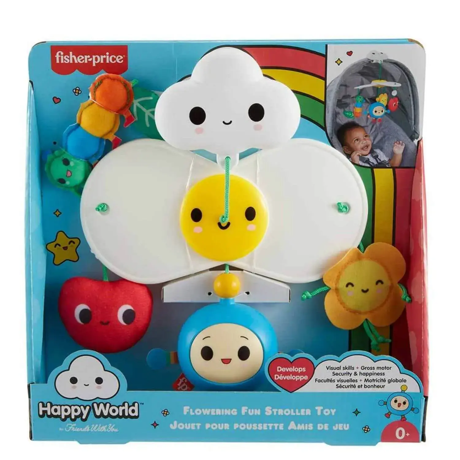 Happy World karakterleriyle duyusal gelişime yardımcı olan oyuncaklardan oluşan çiçek temalı FriendsWithYou bebek arabası dönencesi; yenidoğanlar, yürüme çağındaki çocuklar ile 3 aylık ve daha büyük bebekler içindir.