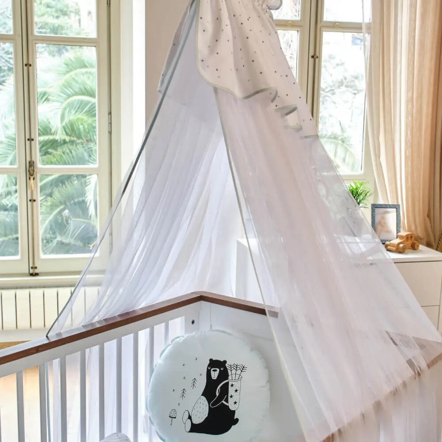 - Hem dekoratif hem de yaz aylarında sineklere karşı koruma sağlayacak bir üründür. Tülde bulunan delikler sayesinde bebeğinizin yatağında cibinlik takılı bile olsa bebeğinizin nefes almasına engel bir durum oluşmaz.