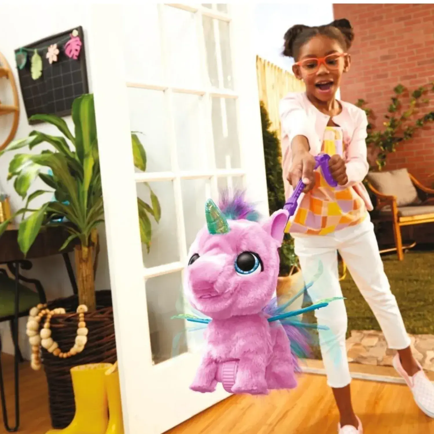 Bu sevimli, kanatlı tek boynuzlu at oyuncağı, onu yerde gezdirmek için iki parçalı çıkarılabilir bir tasma ile birlikte gelir.
