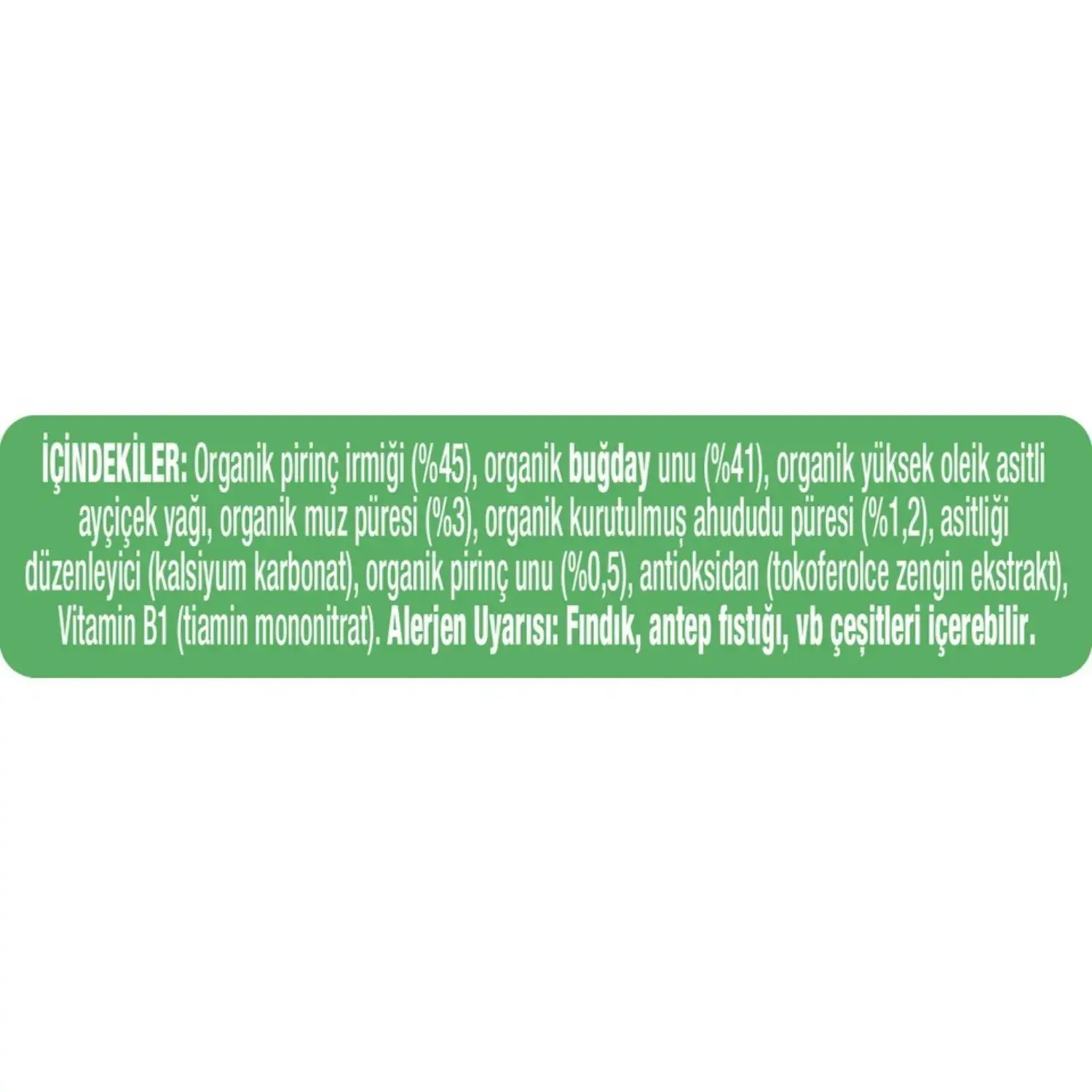 Organik pirin irmiği (%45), buğday unu (%41), organik pirinç unu (%0,5), organik yüksek oleik asitli ayçiçek yağı, organik muz püresi (%3), organik kurutulmuş ahududu püresi (%1,2), asitliği düzenleyici (kalsiyum karbonat), antioksidan (tokoferolce zengin ekstrat), Vitamin B1 (tiamin mononitrat).