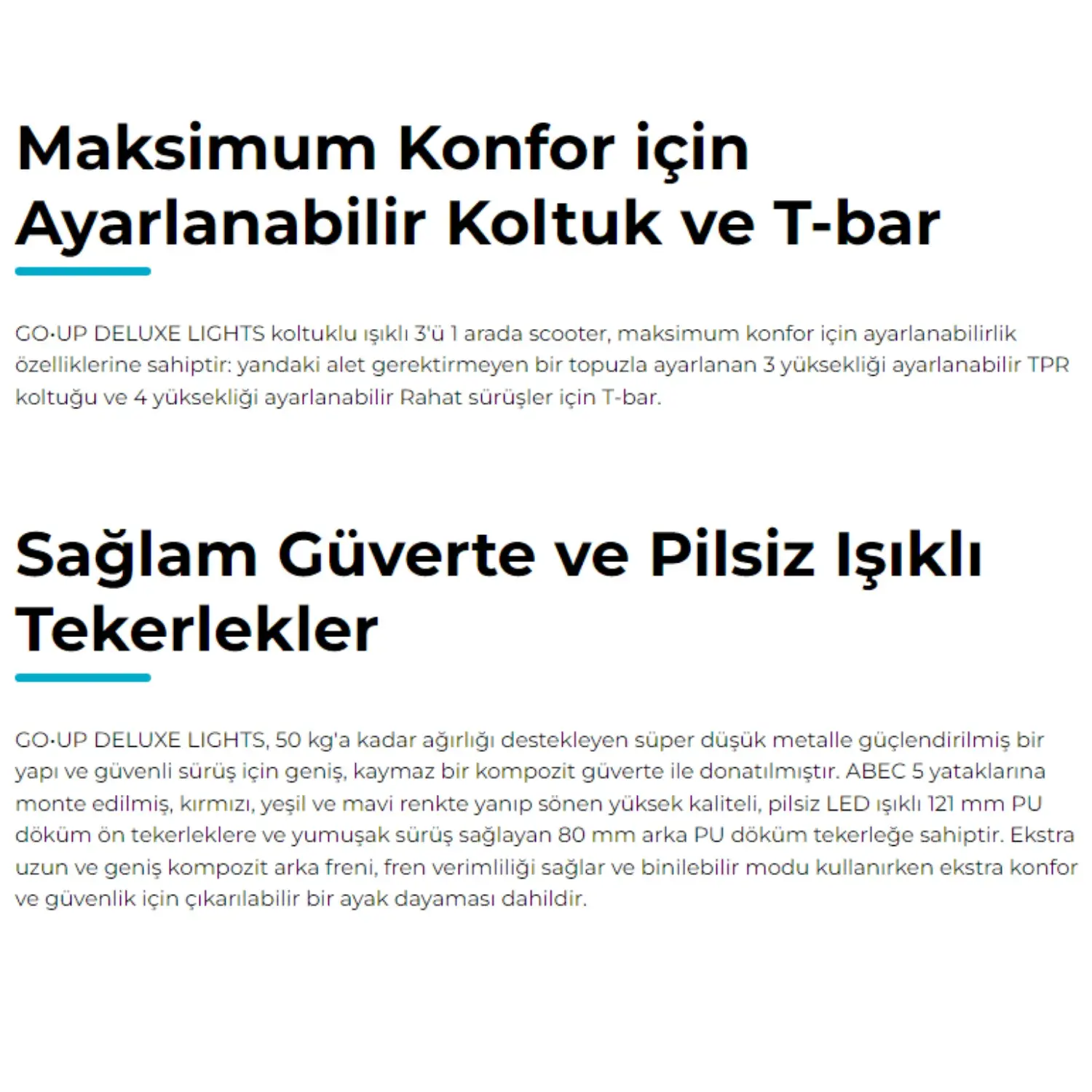 Çocuğunuz kendini hazır hissettiğinde ise kontrol barını 2 teker yönündeki asıl yerine takarak 9 yaşına kadar kullanacağınız o şahane ışıklı çocuk scooter kavuşuyorsunuz… Yani bir ürün ile yıllar boyu farklı kullanım şansı olan şahane bir tasarım…