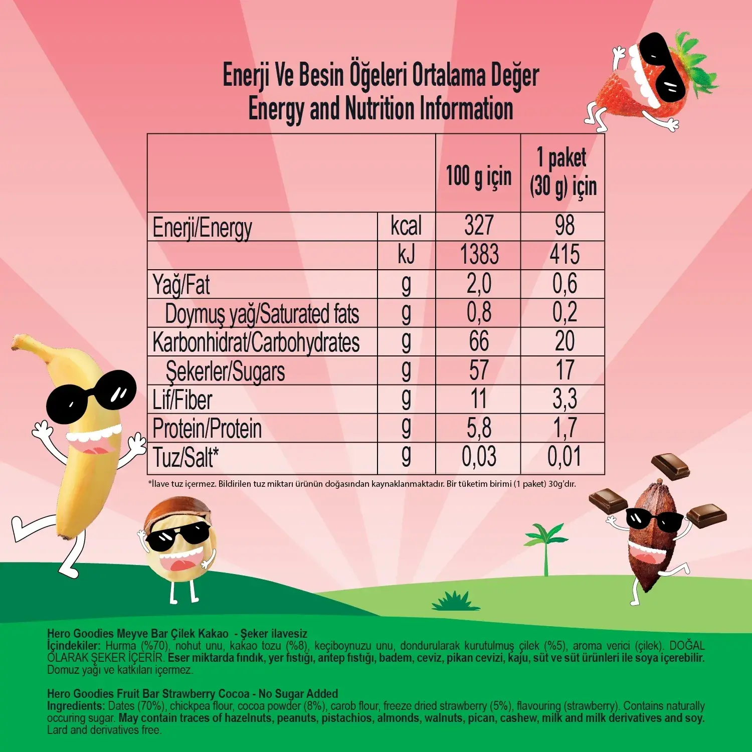 - Ara öğünlerde, beslenme çantalarında bulundurabileceğiniz Hero Goodies Meyve Barlar yüksek lif kaynağı olması sebebiyle besleyici ve çok lezzetli!