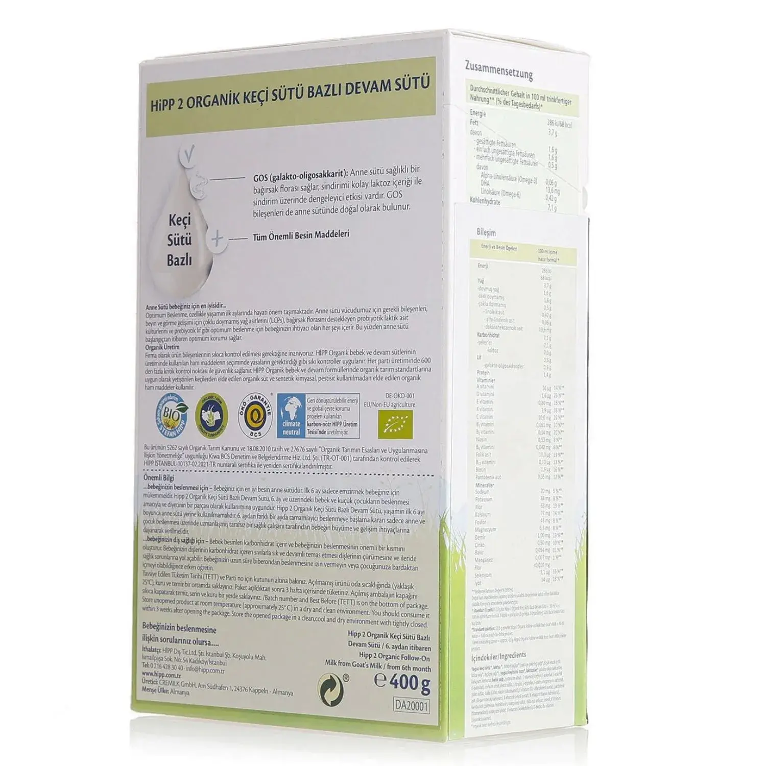 Organik keçi sütü bazlı HiPP formülleri, diğer HiPP formüllerinde etkisi kanıtlanmış organik GOS içerir. Bu diyet lifleri, kalın bağırsakta faydalı laktik asit kültürlerinin büyümesini uyarır ve böylece bağırsak florasını olumlu yönde etkiler.