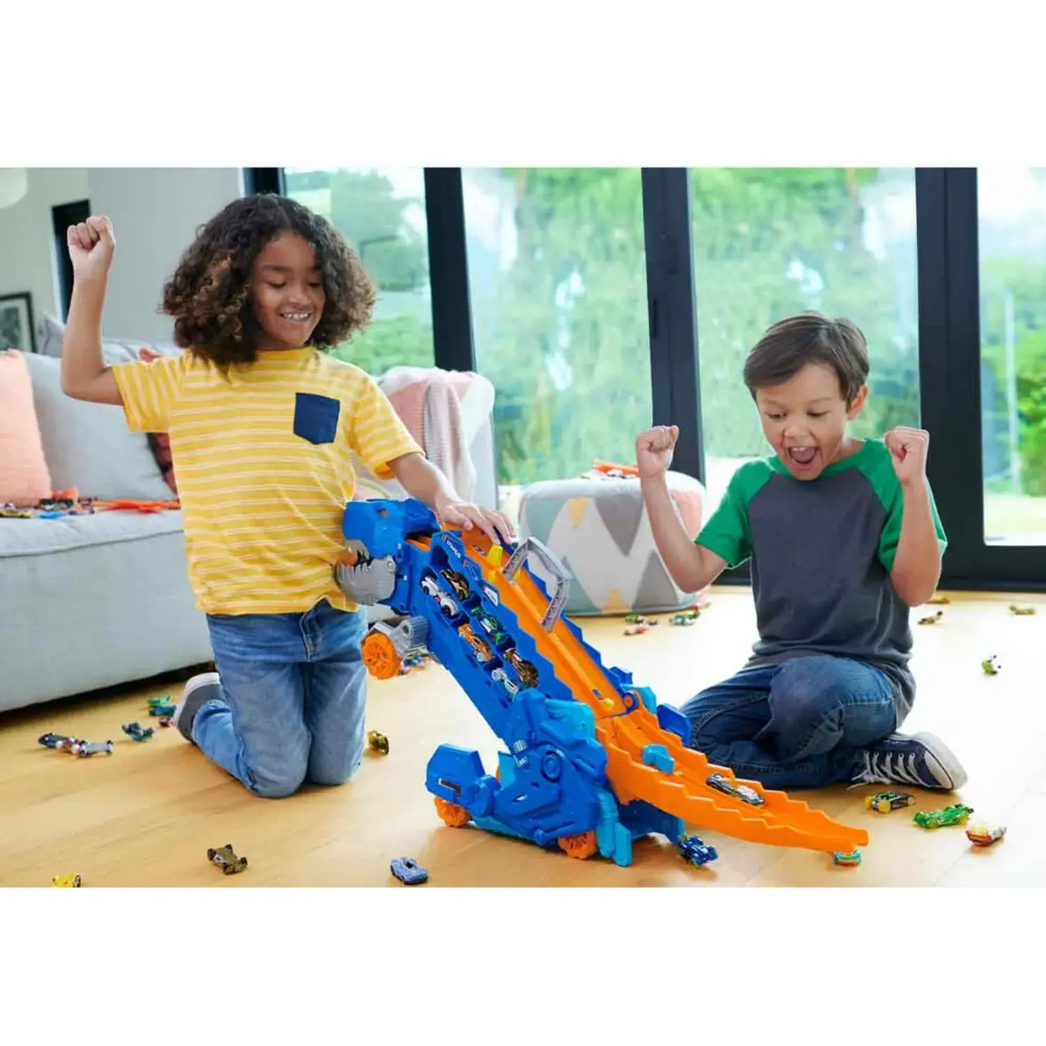 Dikkat dikkat, Hot Wheels City Ultimate Hauler, 20'den fazla 1:64 ölçekli arabayı yutup çekebilir ve ardından sırtında bir yarış pisti olan, homurdanan, ezen bir T-Rex'e dönüşebilir!