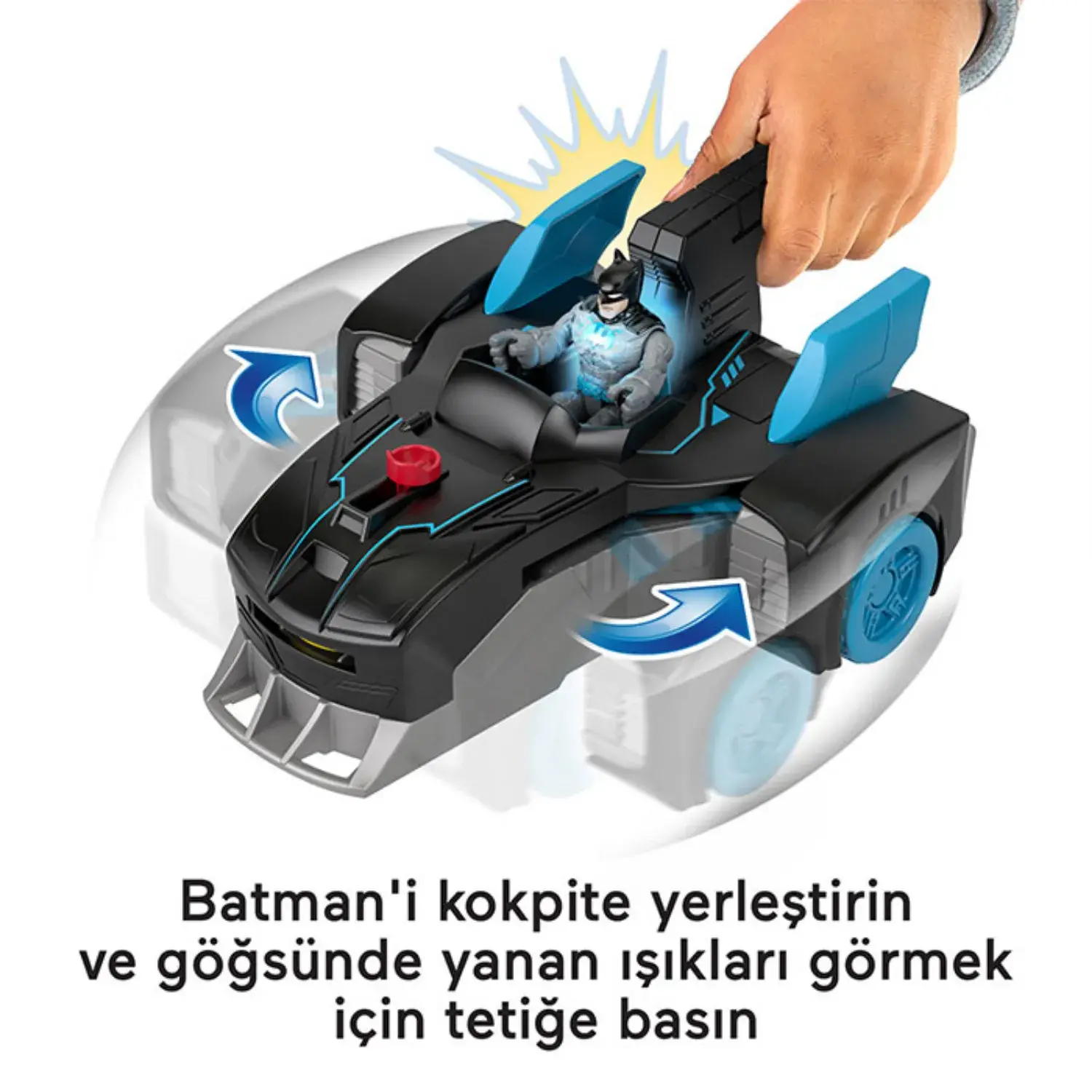 Çocuklar Batman'i sürücü koltuğuna yerleştirip tetiğe bastığında araç, uçak moduna dönüşür ve figürün göğsündeki ışıklar yanar. Uçuyoruz! Süper Kötüler görüş alanınıza girmeye başladığında gizli fırlatıcıdaki diskleri fırlatmak için tetiğe basın. Bu kötü adamların kaçacak hiçbir yeri yok!