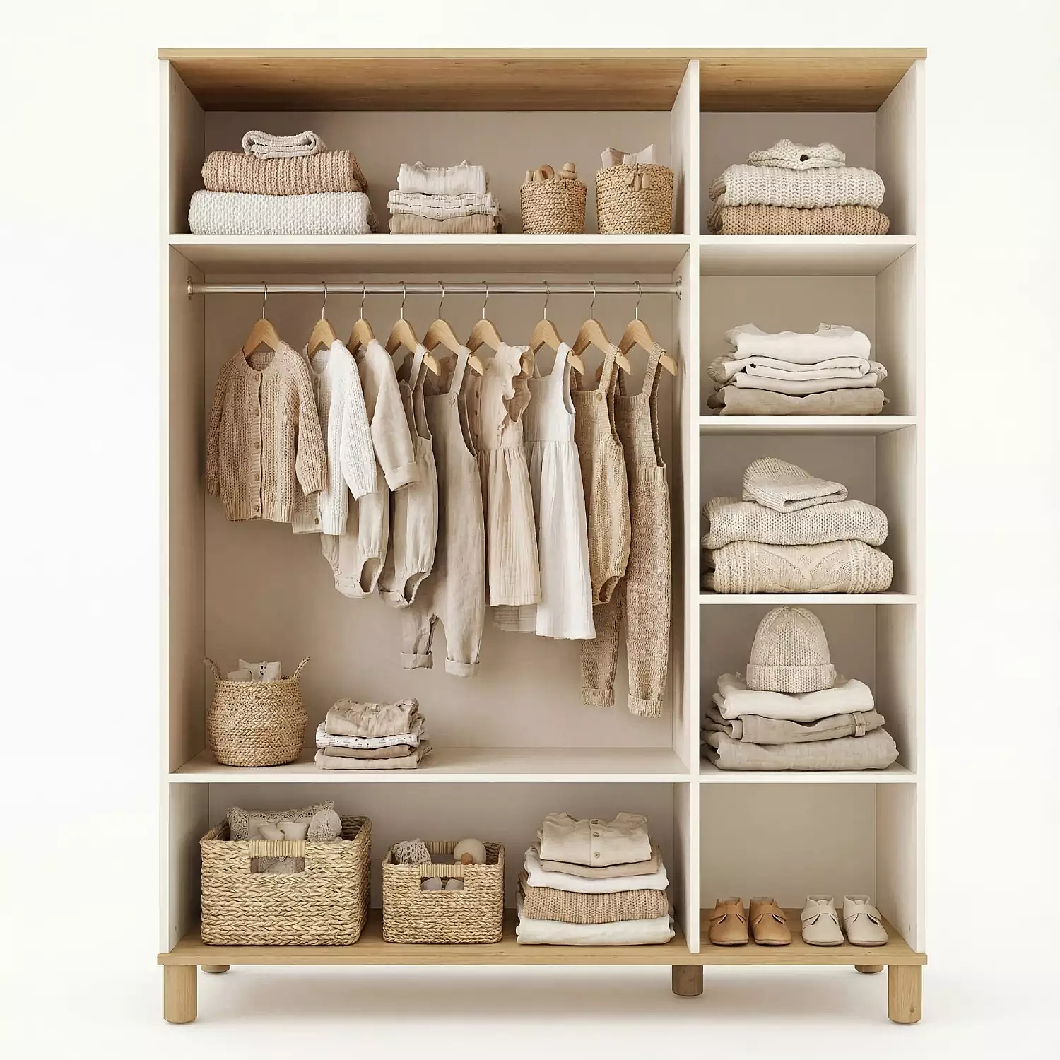 Kanz Kapadokya Gardolap, bohem şıklığı modern çizgilerle buluşturan, doğal bej tonları ve ahşap detaylarıyla bebeğiniz için huzurlu bir yaşam alanı sunan özel bir koleksiyondur. Doğadan ilham alan sade tasarımı sayesinde odada sıcak, güvenli ve dingin bir atmosfer oluşturur.