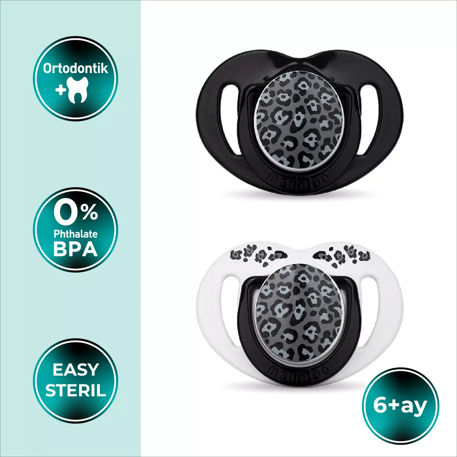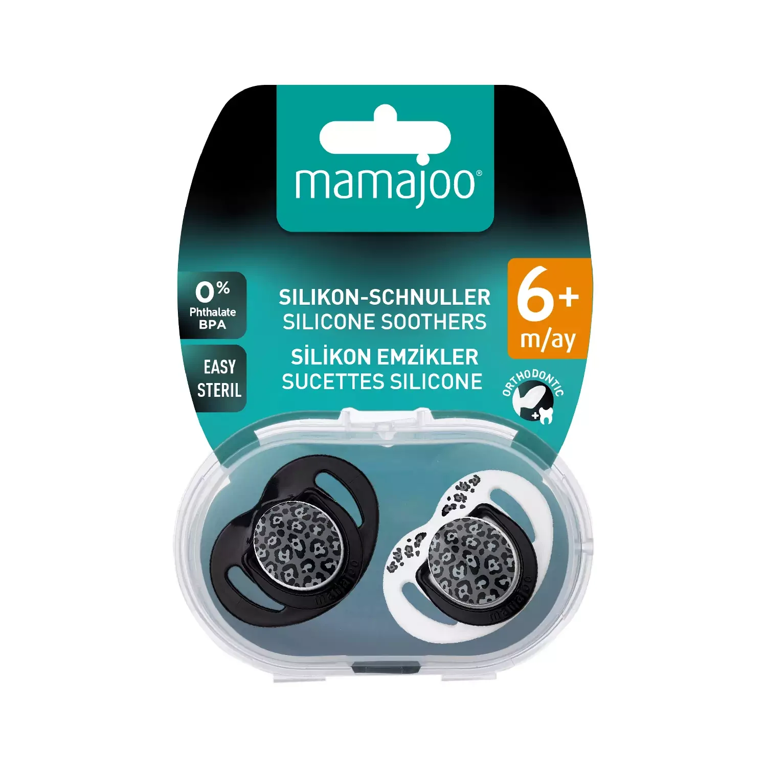 - Mamajoo Sterilizasyon & Saklama Kutulu İkili Desenli Ortodontik Antrasit Leopar Emzikleri, BPA ve Fitalat içermeyen yüksek kaliteli hammaddeler ile yüksek kaliteli şeffaf, tatsız ve kokusuz silikondan üretilmiştir. Her yaş grubu için ideal yumuşaklıkta ve pürüzsüz olup kolay temizlenir.