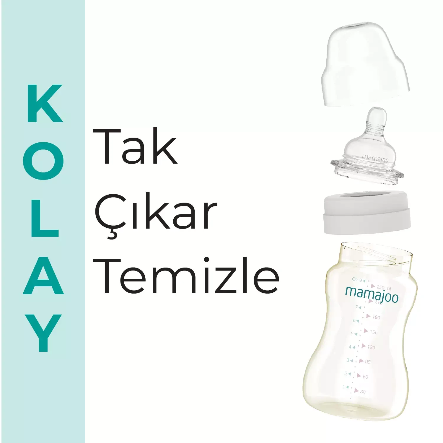 - Küçük parçaları olmadığından kolay temizlenebilen Mamajoo Biberonlar, sterilizasyon cihazında steril edilebilir.