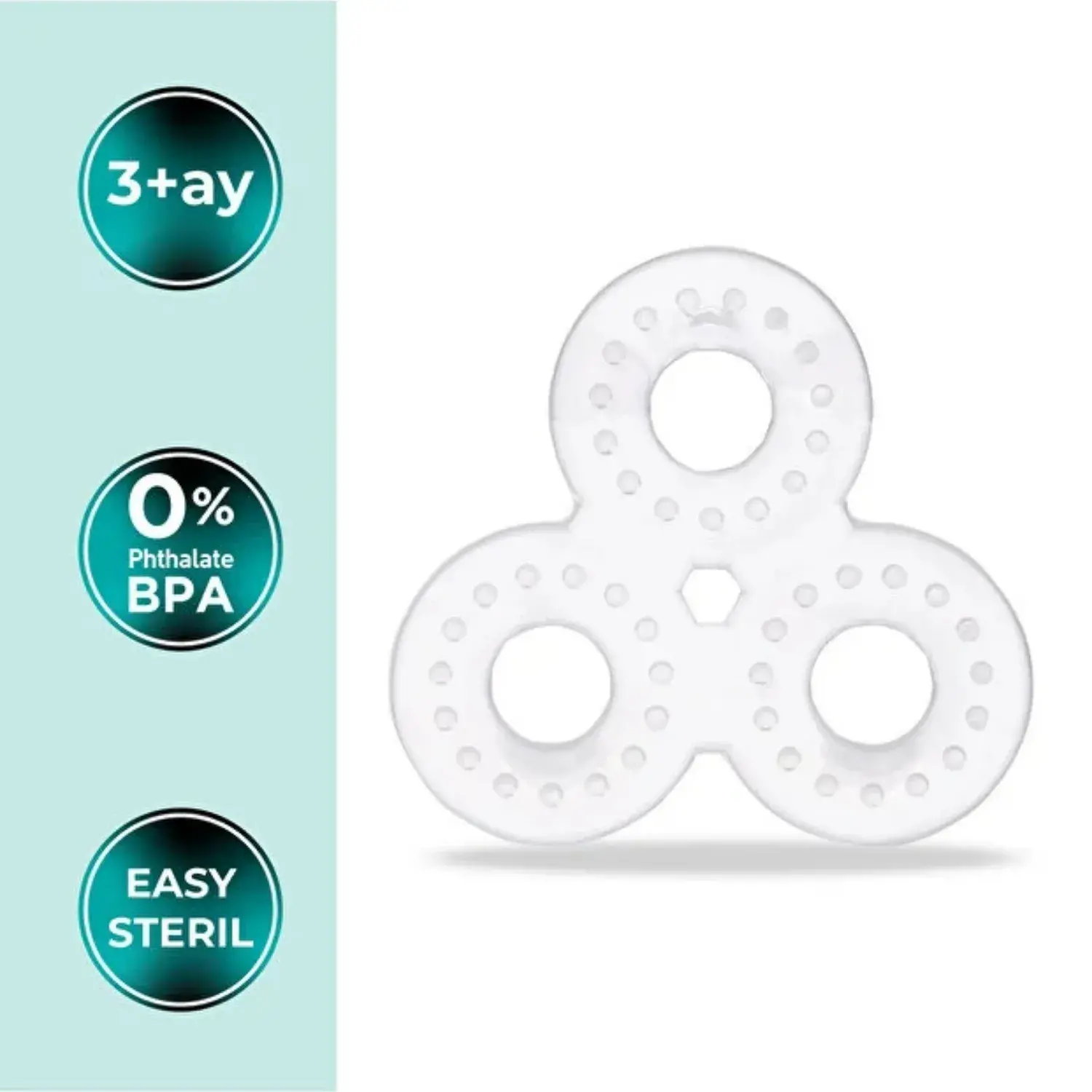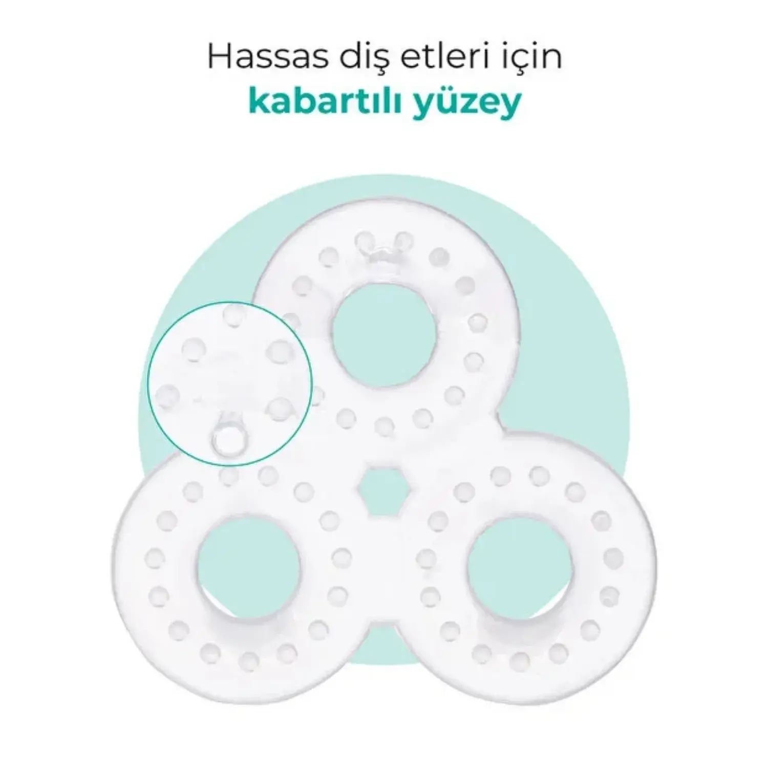 Kabartılı yüzeyi ve halkalı tasarımıyla hem diş etlerini rahatlatır hem de ince motor gelişimini destekler.