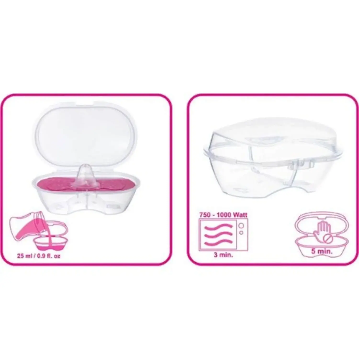 Göğüs ucu koruyucularınızı iyice yıkayıp Mamajoo Sterilizasyon & Saklama Kutusuna yerleştirin ve 25 ml su ekleyin. Mikrodalganızı 750 – 1000 W’a ayarlayıp 3 dakika çalıştırın. Sonrasında bir süre soğumaya bırakıp içindeki suyu döktükten sonra ürünleriniz hijyenik olarak kullanıma hazır olacaktır.