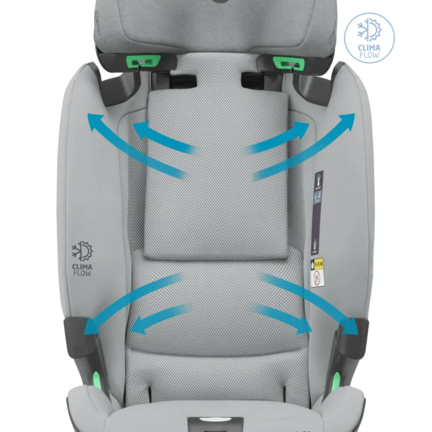 Günlük yolculuklar ve uzun tatil gezileri, yumuşak oturma minderi ve dört farklı yatış pozisyonunu ayarlama imkanı (sadece 4 yaşına kadar olan çocuklar için!) sayesinde daha da rahat . ClimaFlow paneli , nefes alabilen malzemelerle birlikte hoş bir hava sirkülasyonu sağlar. Küçük yolcunuz için her zaman en uygun sıcaklık vardır.