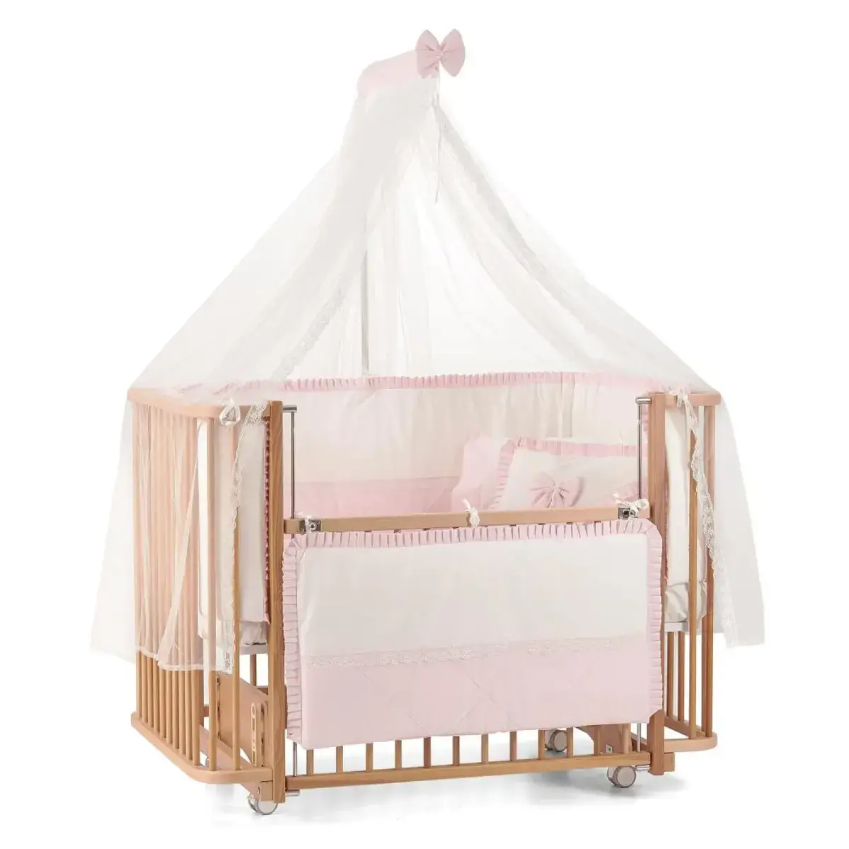- Asansörlü ön panel sayesinde anne yanı olarak kullanılabilir. Bebeğin gece boyunca annesinin yanında olmasını sağlar, uyandığında veya emzirme ihtiyacı olduğunda annenin de konforunu artıran bir beşik türüdür. Ön panel gerektiğinde iptal edilebilir.