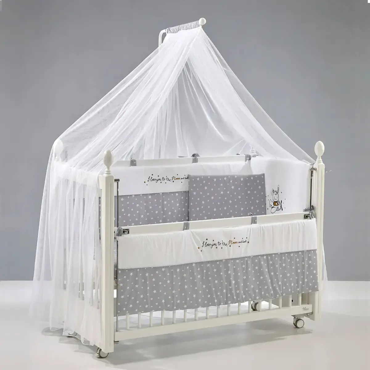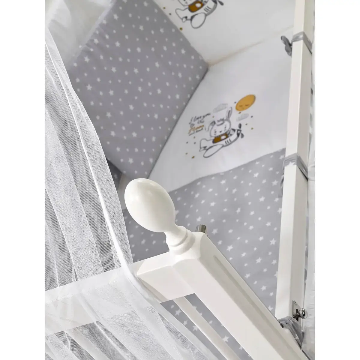 OEKO-TEX Sertifikalı 9 Parçalı Uyku Seti: Yumuşacık pamuklu kumaştan üretilmiştir. 1 adet yorgan, 1 adet çarşaf, 1 adet yastık kılıfı, 1 adet nakışlı yastık kılıfı, 1 adet fermuarlı kısa kenar koruma, 2 adet fermuarlı uzun kenar koruma, 1 adet cibinlik tülü, 1 adet cibinlik aparatı