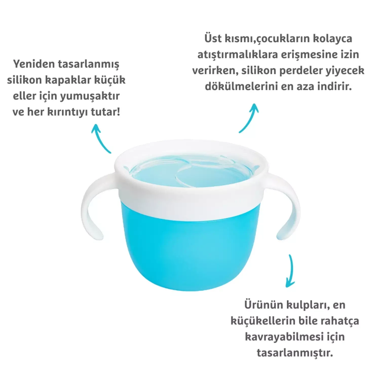 Bu ürün, çocukların atıştırmalıklarını daha bağımsız bir şekilde tüketmelerine yardımcı olmak amacıyla tasarlanmıştır. Üst kısmı,çocukların kolayca atıştırmalıklara erişmesine izin verirken, silikon perdeler yiyecek dökülmelerini en aza indirir.