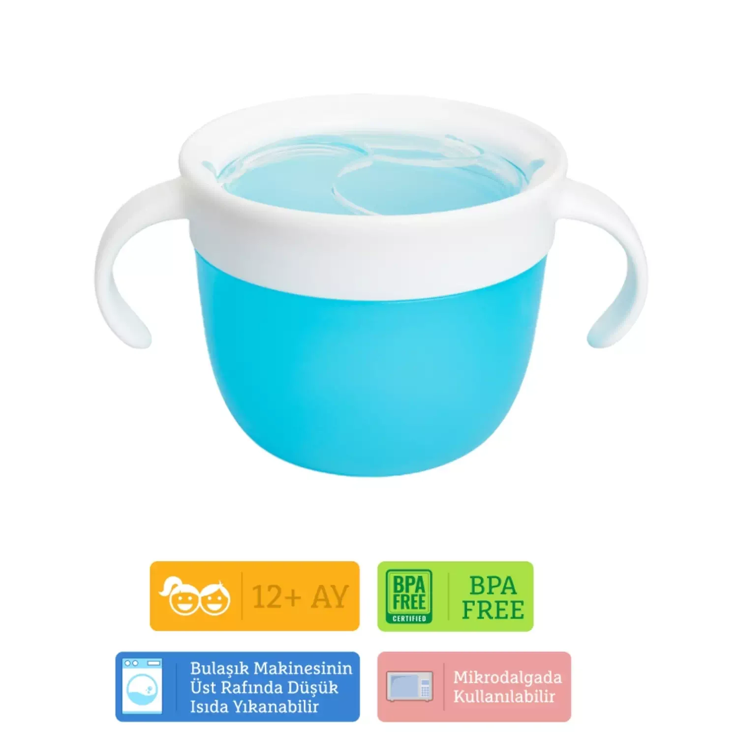 BPA içermez ve üst rafında bulaşık makinesinde düşük ısıda yıkanabilir. 12 Ay ve üzeri çocukların kullanımı için uygundur. 9 ons (yaklaşık 266 ml) kadar atıştırmalıkkapasitesine sahiptir.