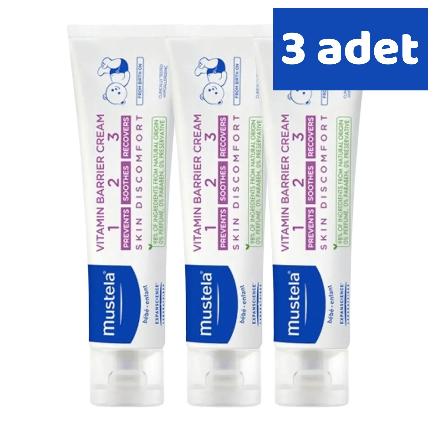 Mustela Vitamin Bariyer Bebek Pişik Kremi patentli doğal aktif bileşenlerin eşsiz kombinasyonu sayesinde tahriş ve kızarıklığa neden olan faktörleri gidermeye yardımcı olmak için özel olarak formüle edilmiştir.Mustela 123 Vitamin Bariyer Pişik Kremi, klinik olarak test edildiği için her gün güvenle kullanabilirsiniz.%98 doğal kökenli içeriklerle formüle edilmiş krem, parfüm ve paraben içermez. Bu sayede doğumdan itibaren kullanımda yüksek tölorans sunar.Bebeğinizin bez değişimi sürecinin keyifli geçmesi için Mustela 123 Vitamin Bariyer Pişik Kremi.Çok kolay bir şekilde uygulanabilir ve kolaylıkla durulanabilir.